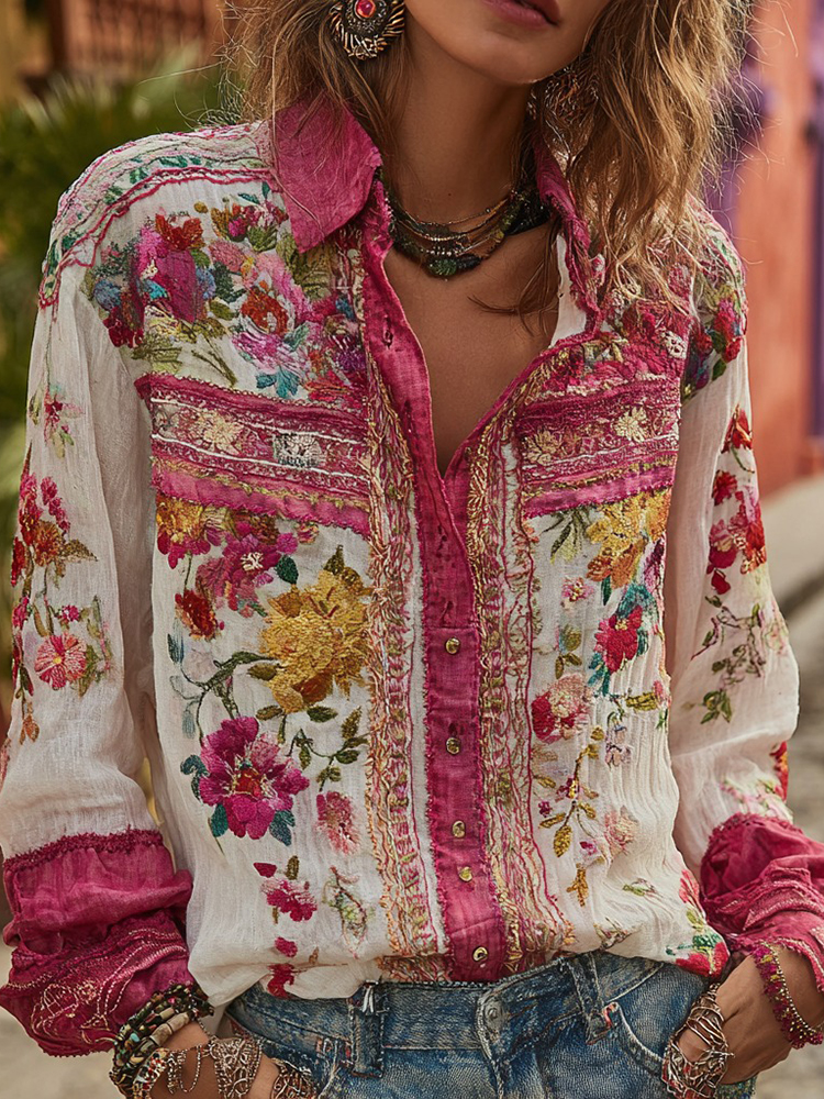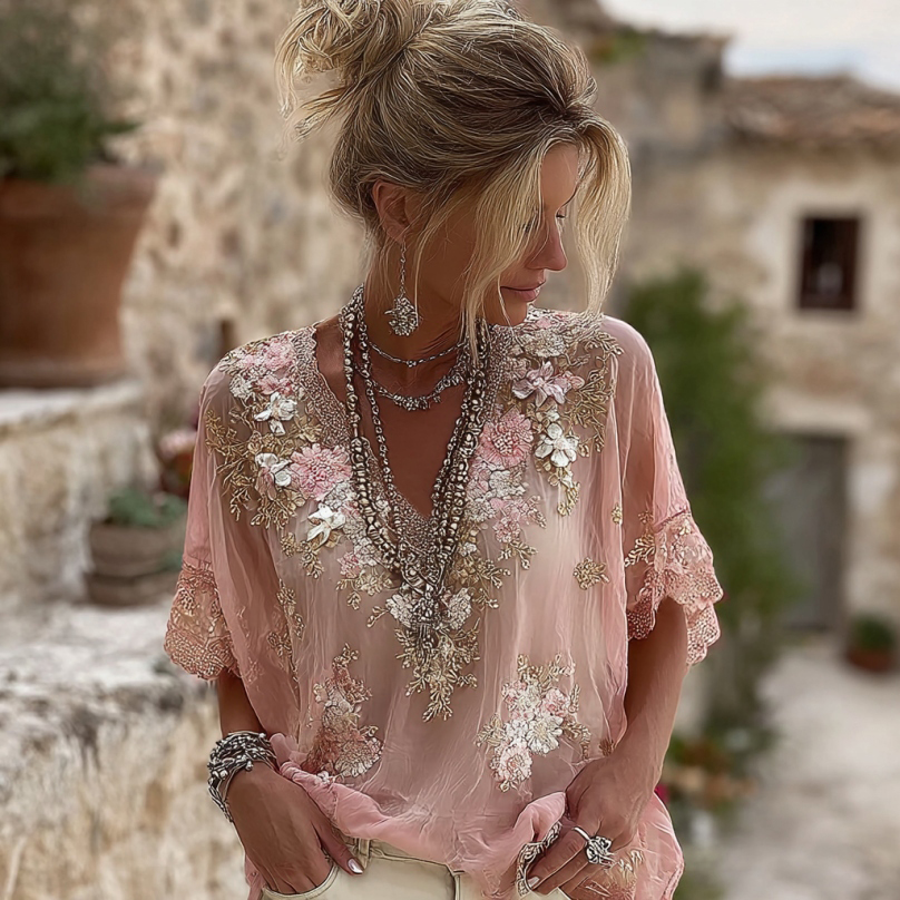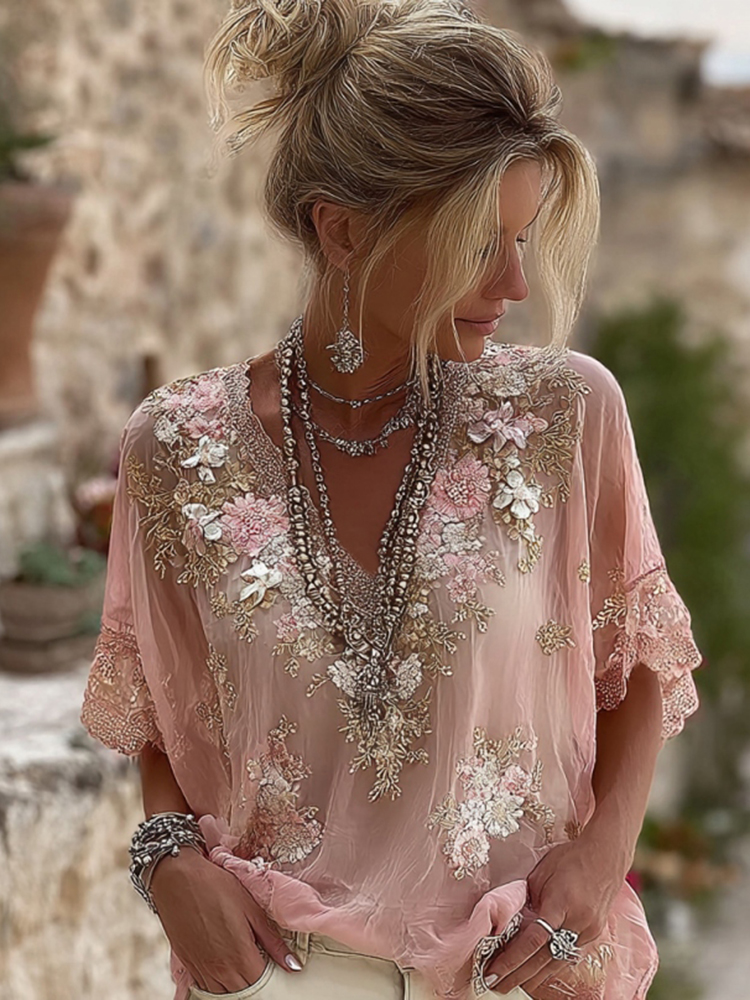 Women's Floral Pattern Linen V-neck T-shirt$17.39 USD