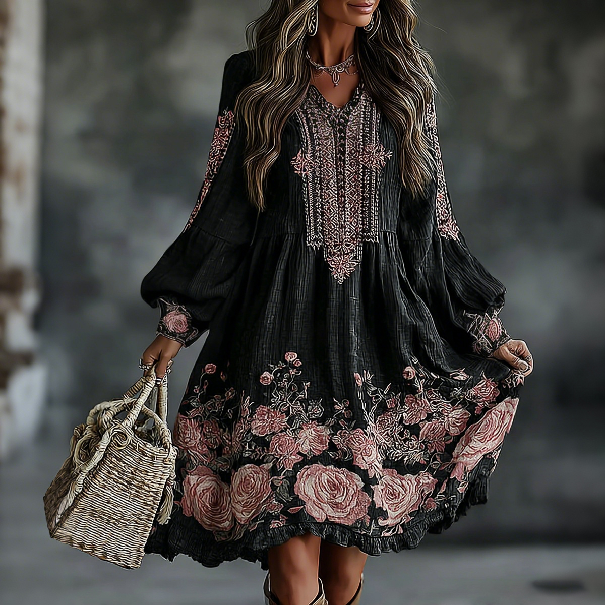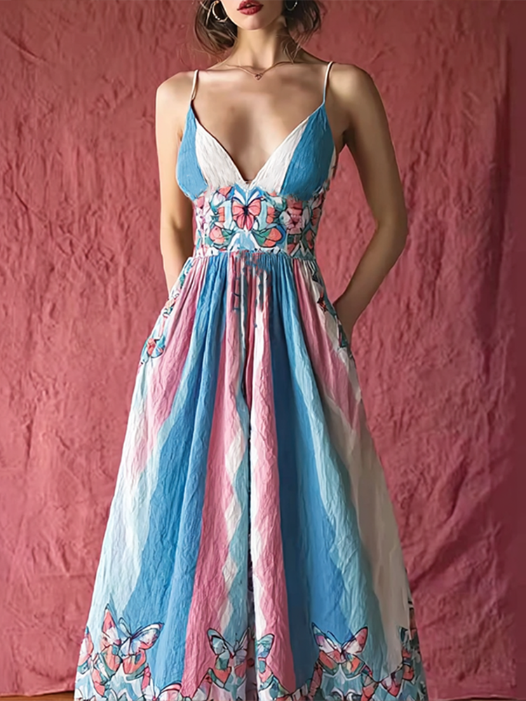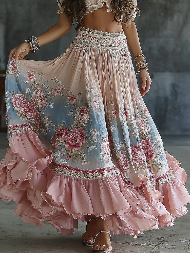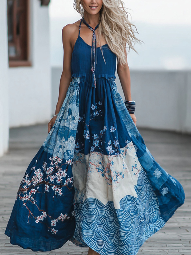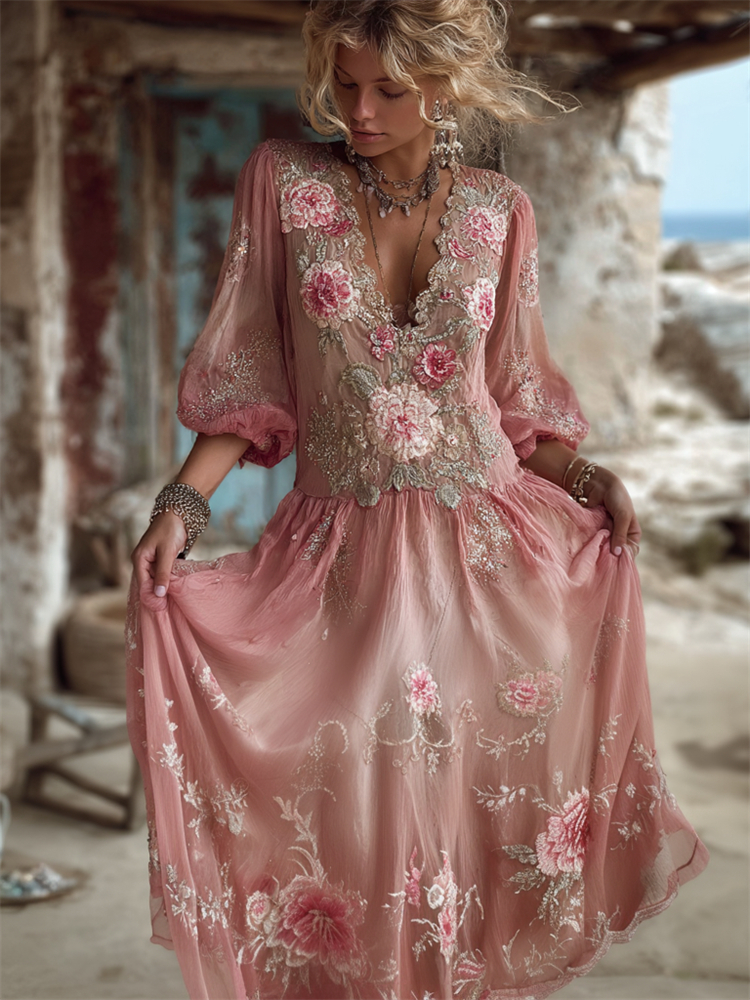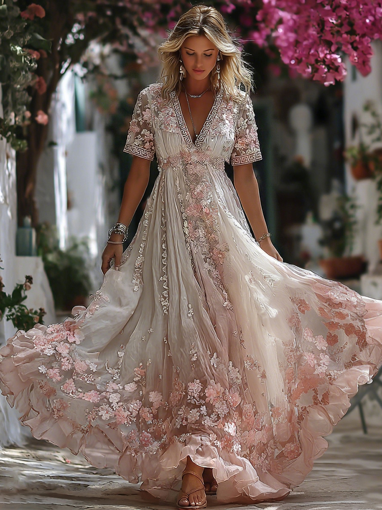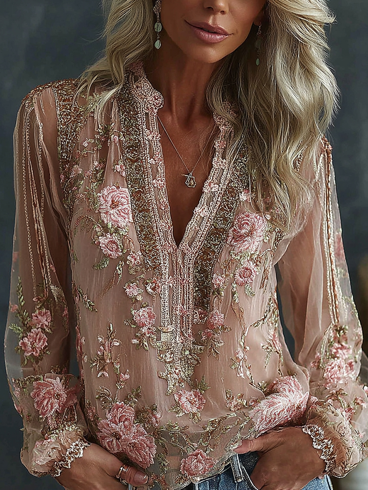 Women's Floral Pattern Linen V-neck T-shirt$17.39 USD