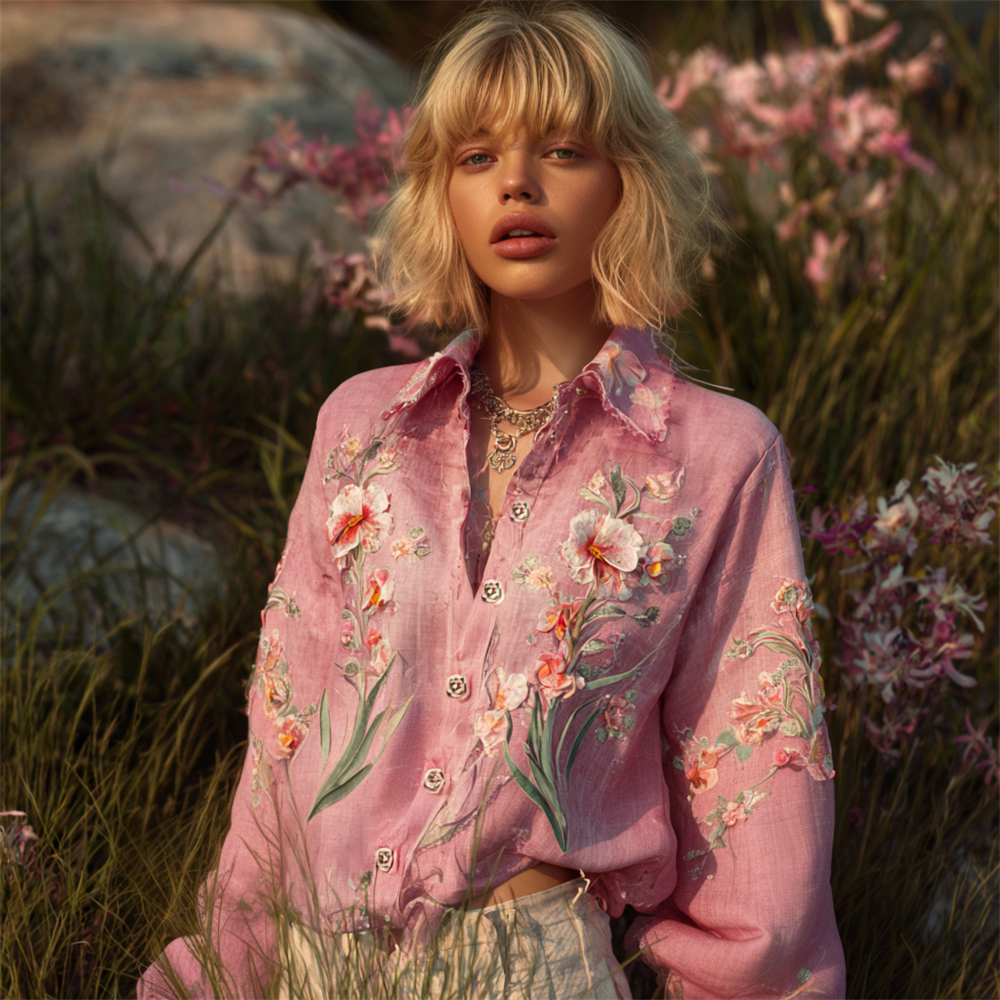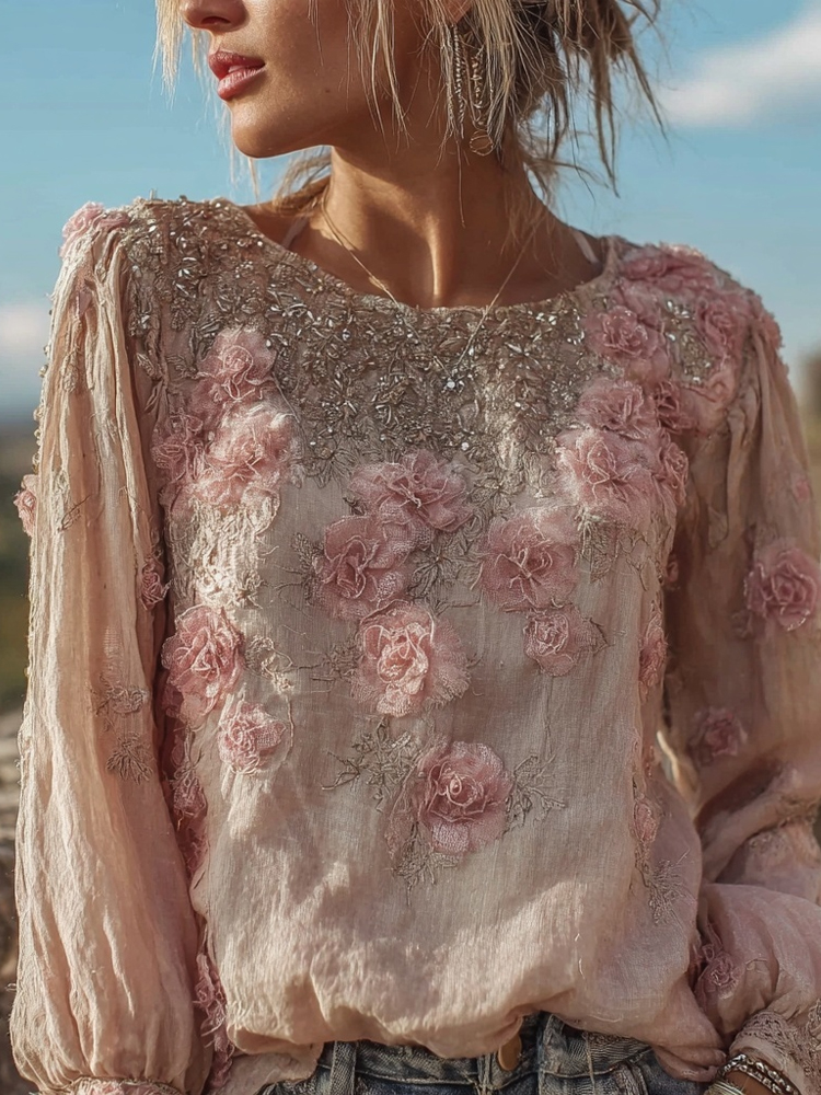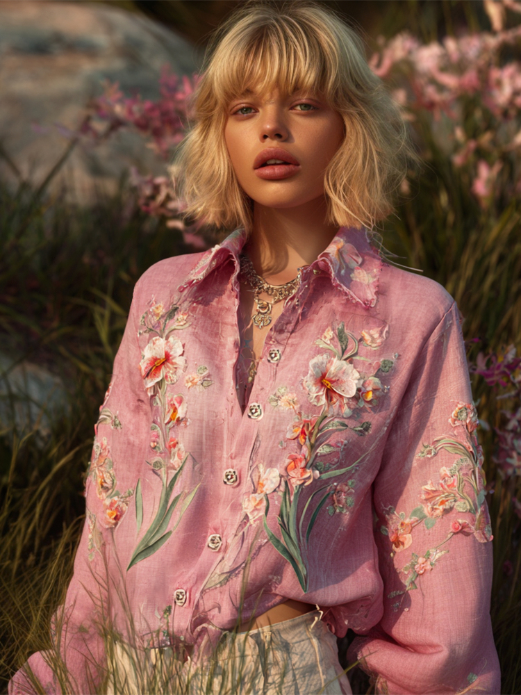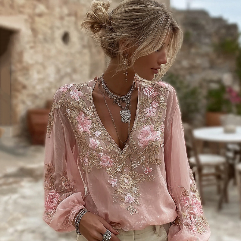 Women's Vintage Pink Floral Embroidered Art V-neck Long Sleeve Blouse
