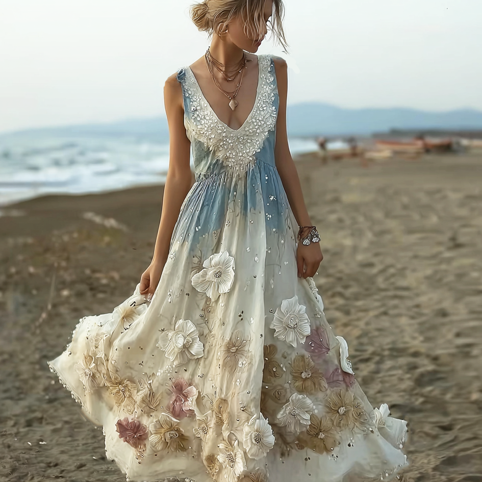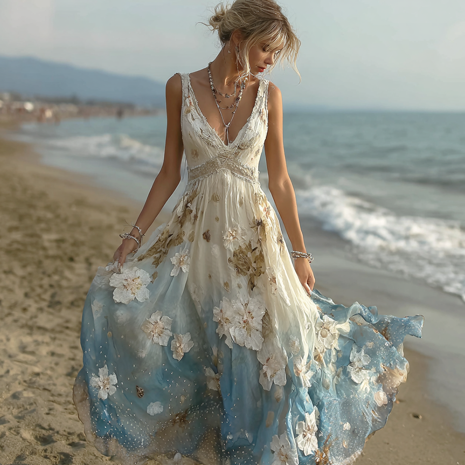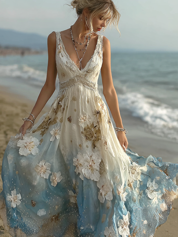 Bohemian Style Plant Flower Gradient Color Long Dress