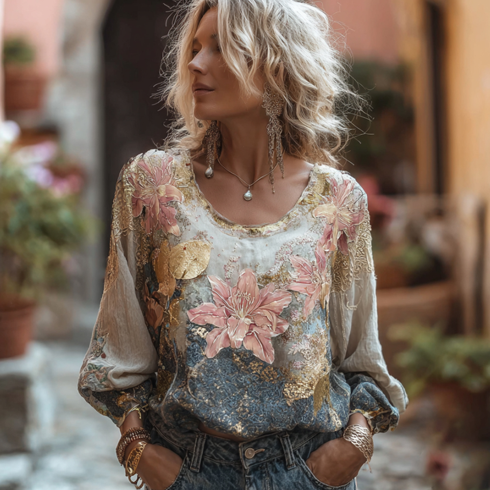 Women's Bohemian Lily Print Dyeing Gold Round Neck Long Sleeve Top