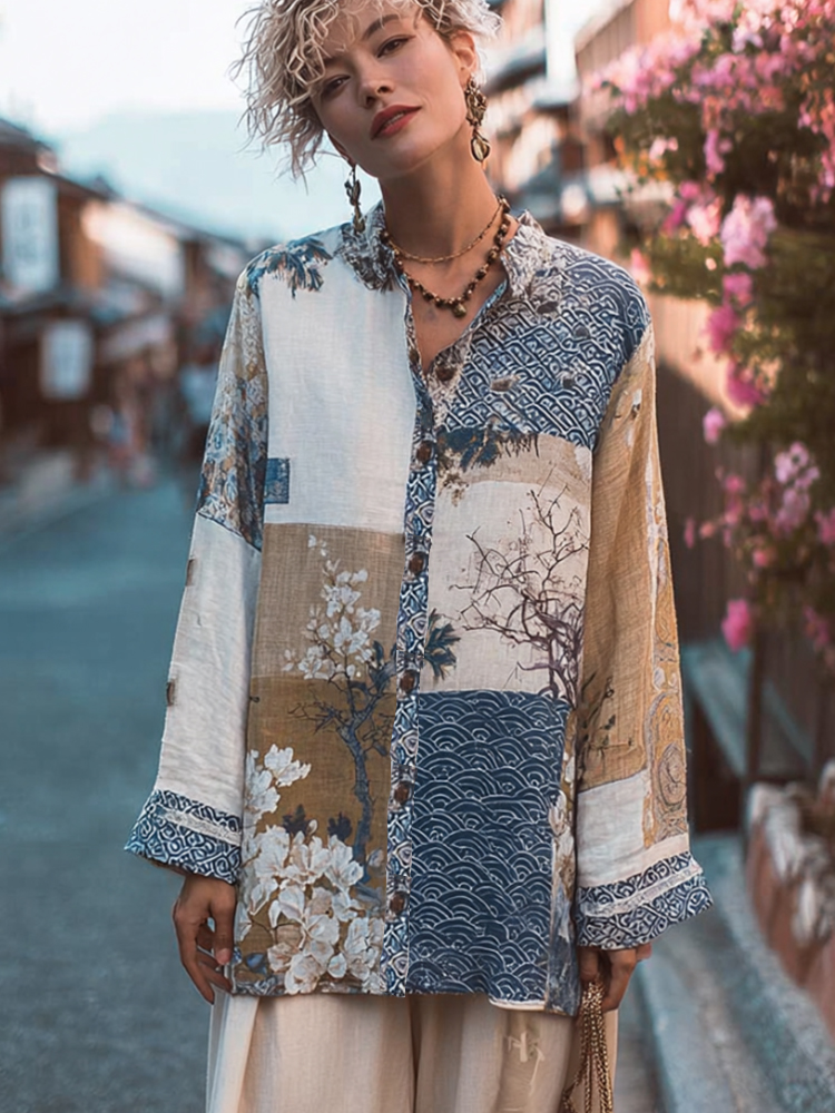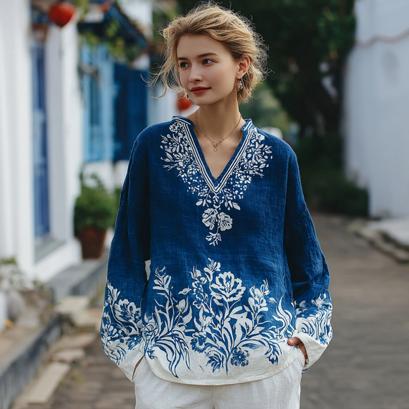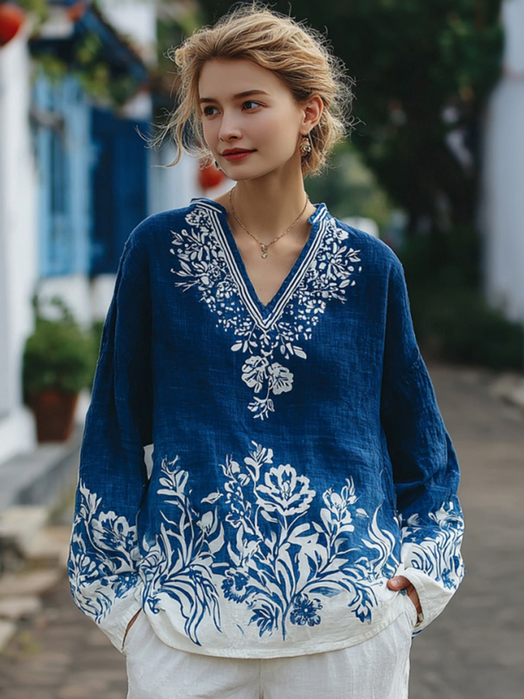 Women's Floral Pattern Linen V-neck T-shirt$19.19 USD