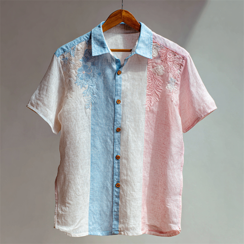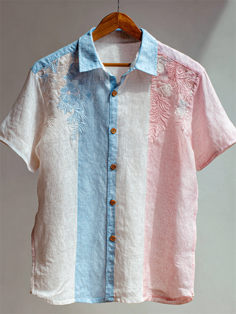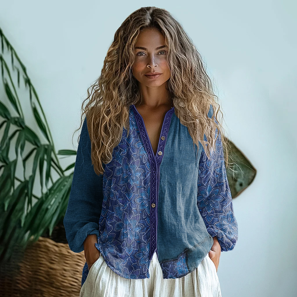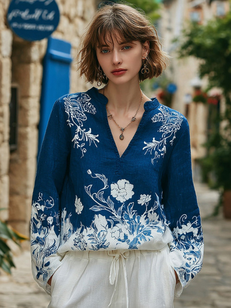 Women's Floral Pattern Linen V-neck T-shirt$19.19 USD