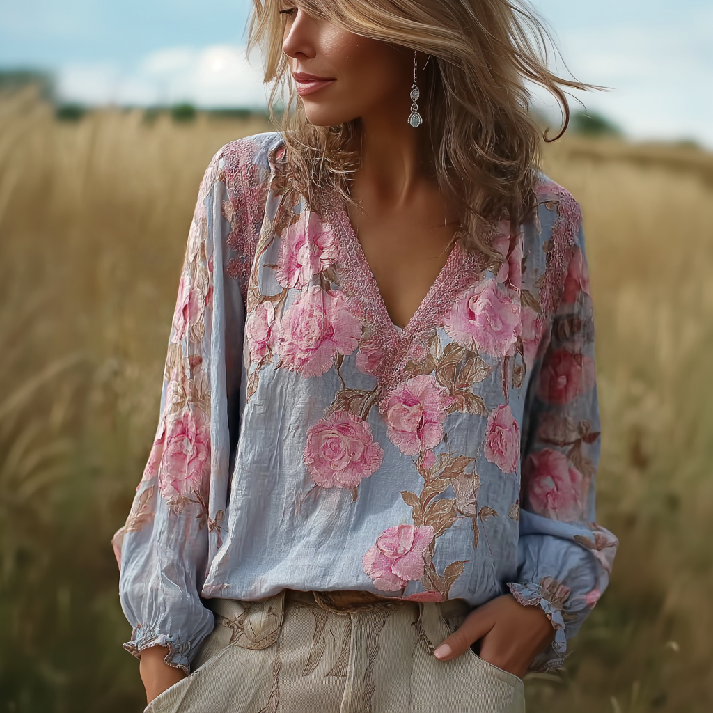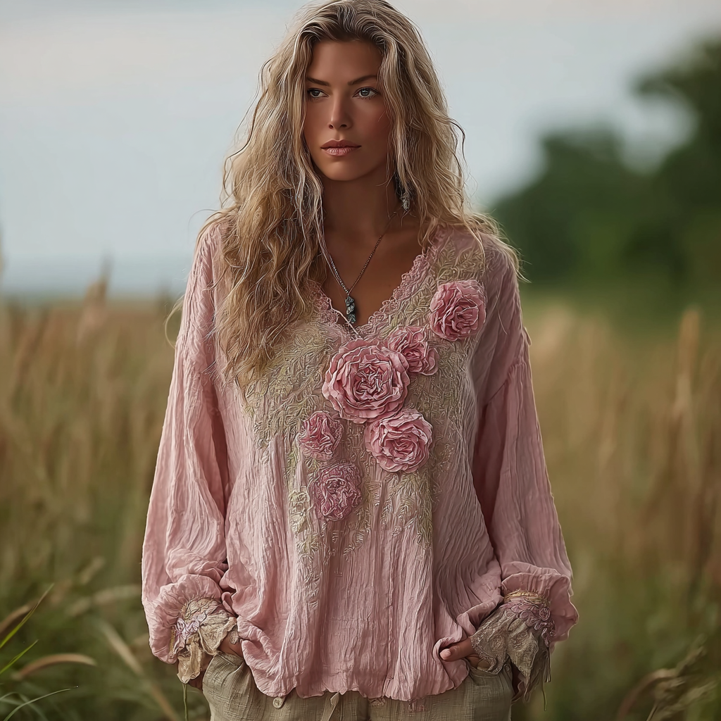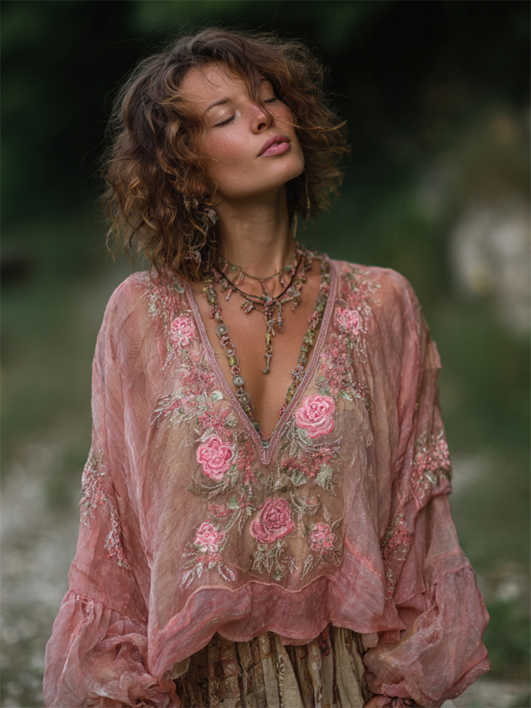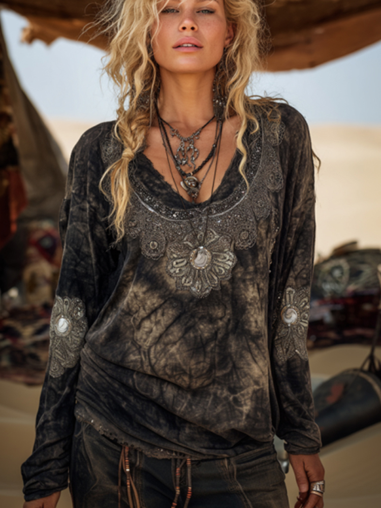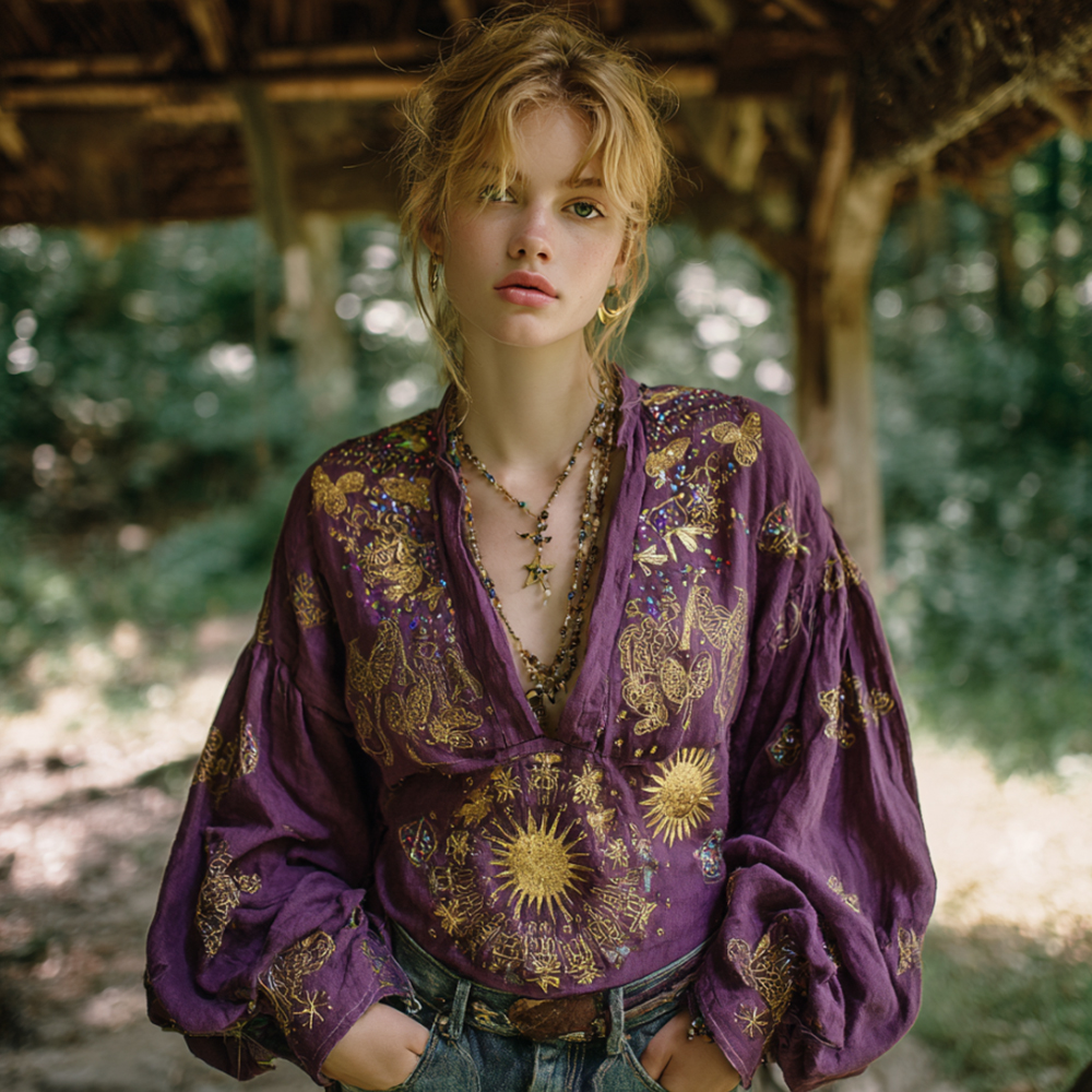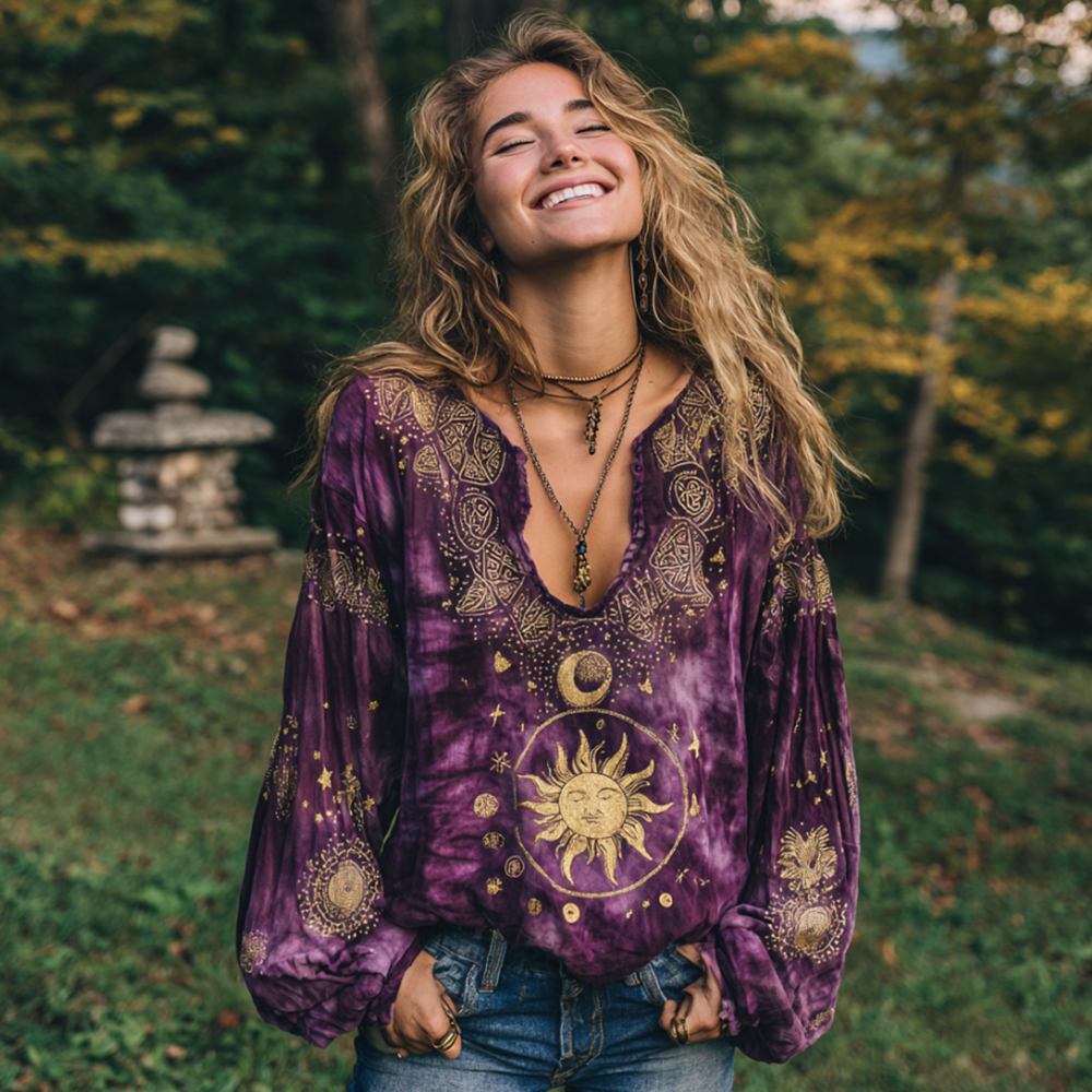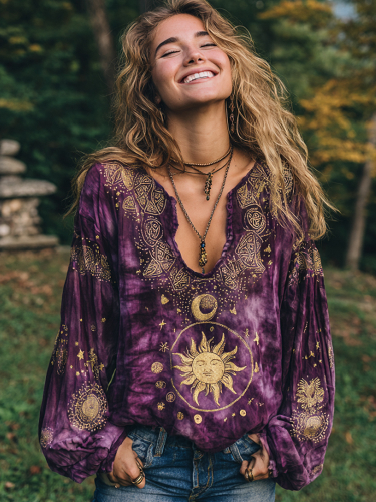 Mysterious Sun And Moon Art V-neck Linen Top$17.39 USD