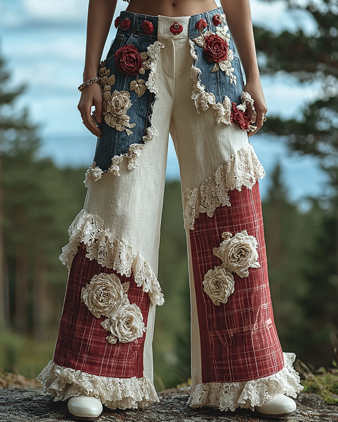 Women's Spring Floral Embroidered Plaid Patchwork Design Trousers 1871$17.63 USD$56.65 USD