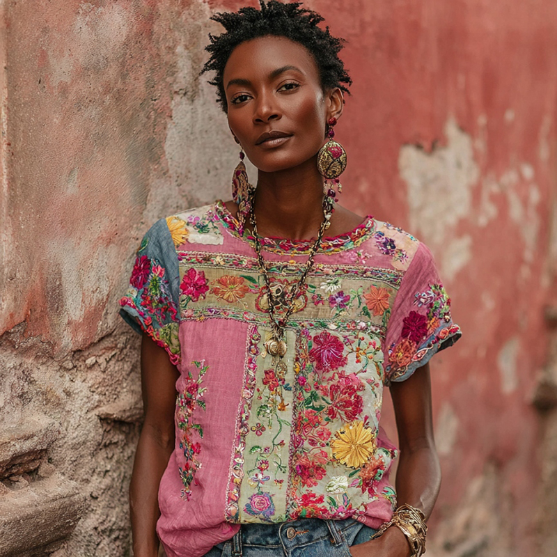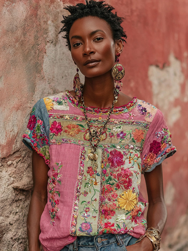 Women's Bohemian Floral Embroidered V-neck T-shirt