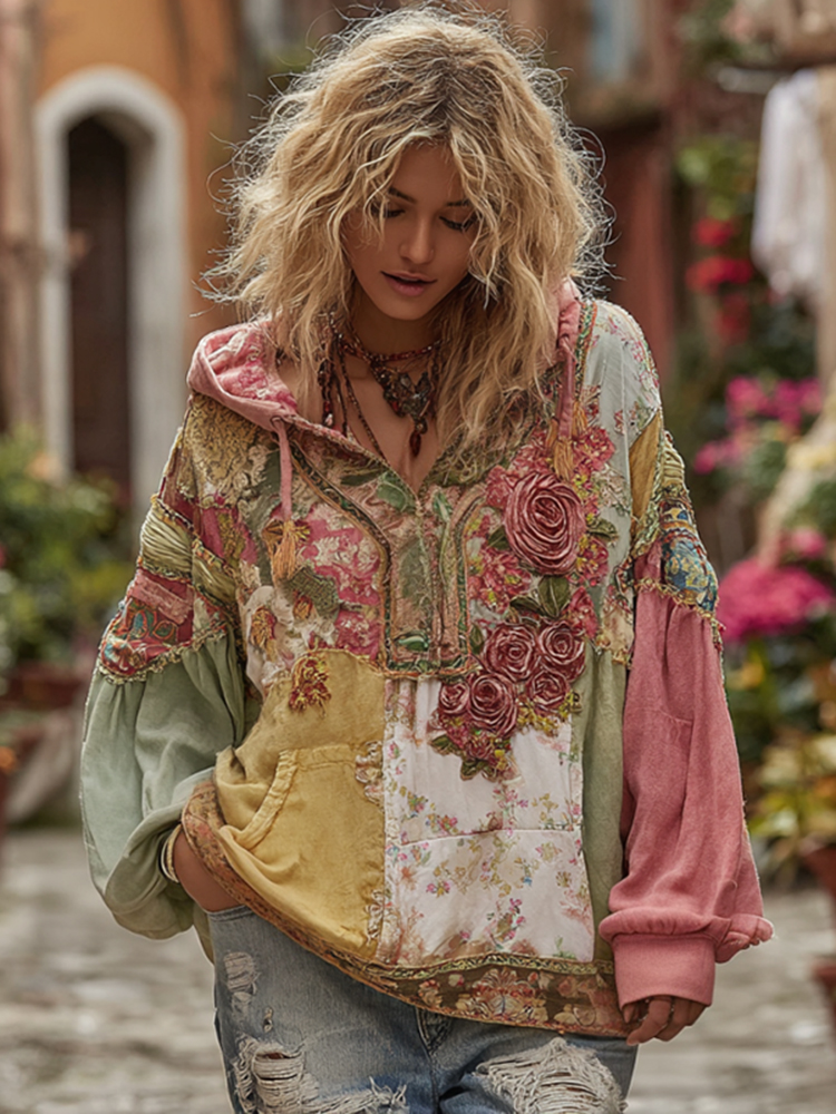 Women's Bohemian Floral And Rose Patchwork Cozy Warm Hoodie