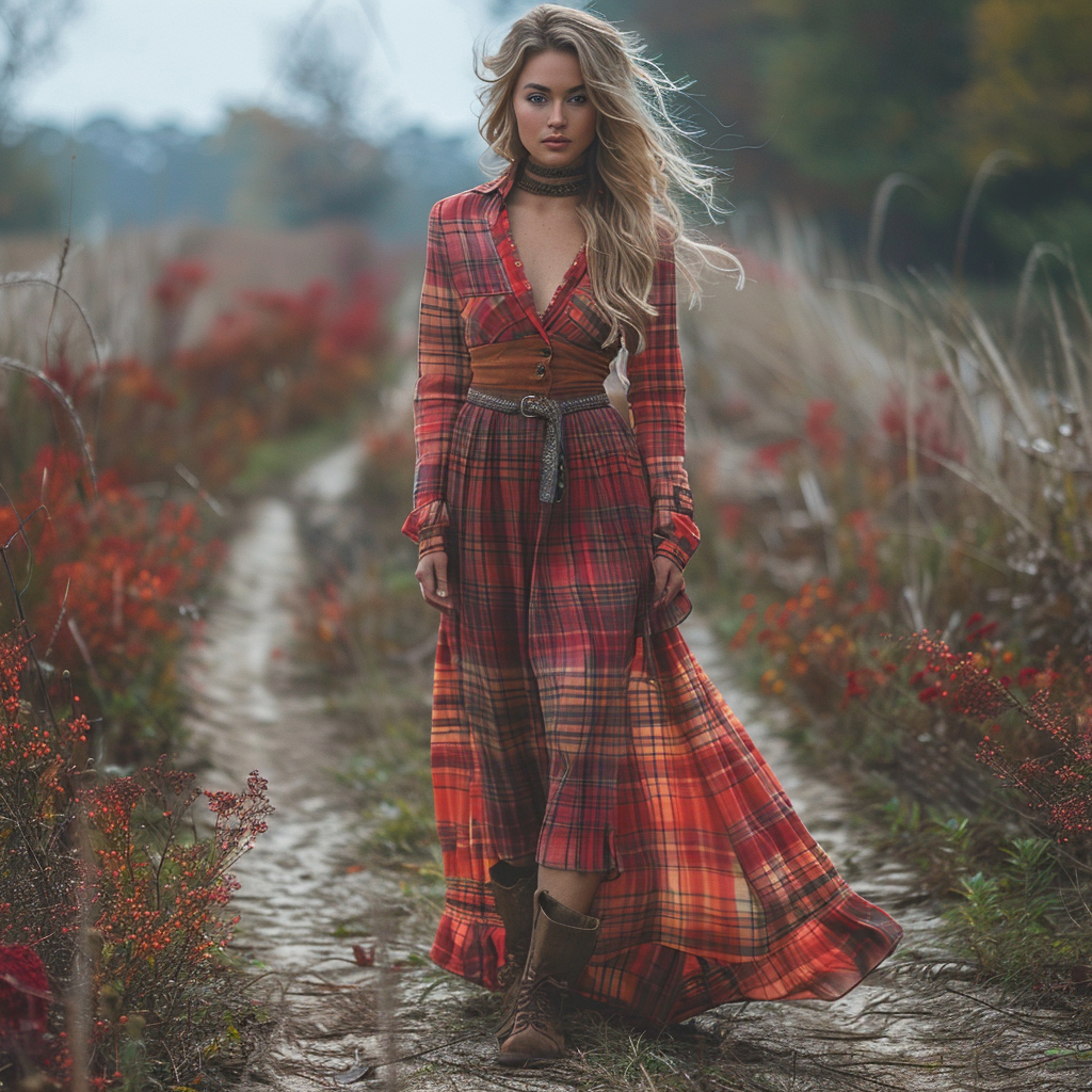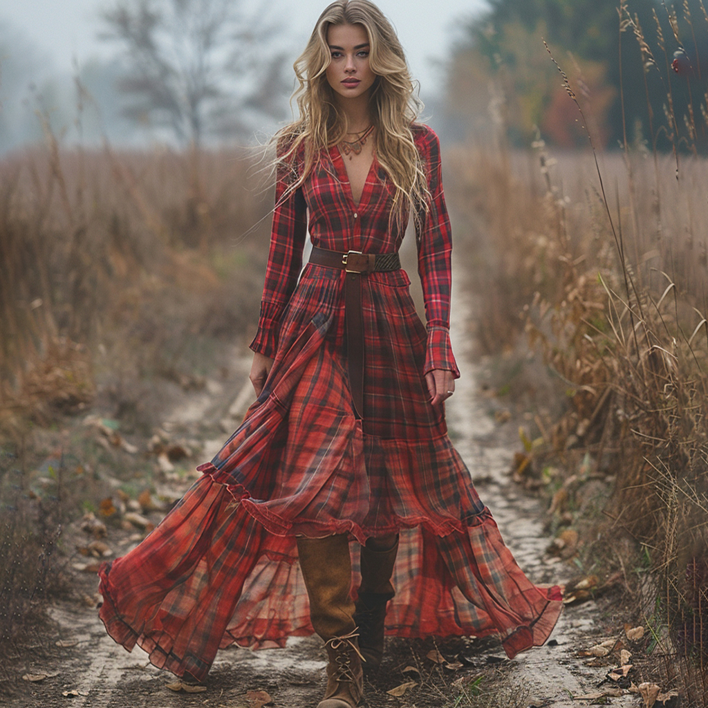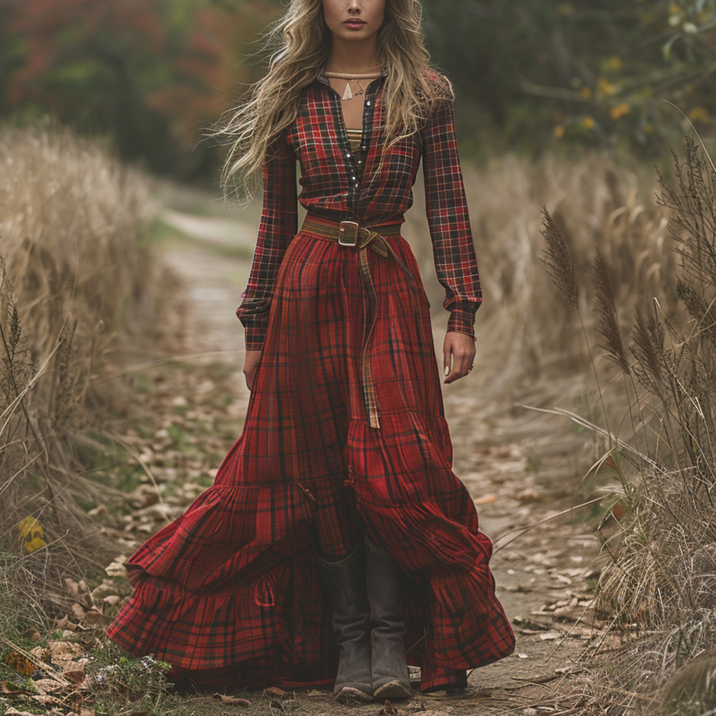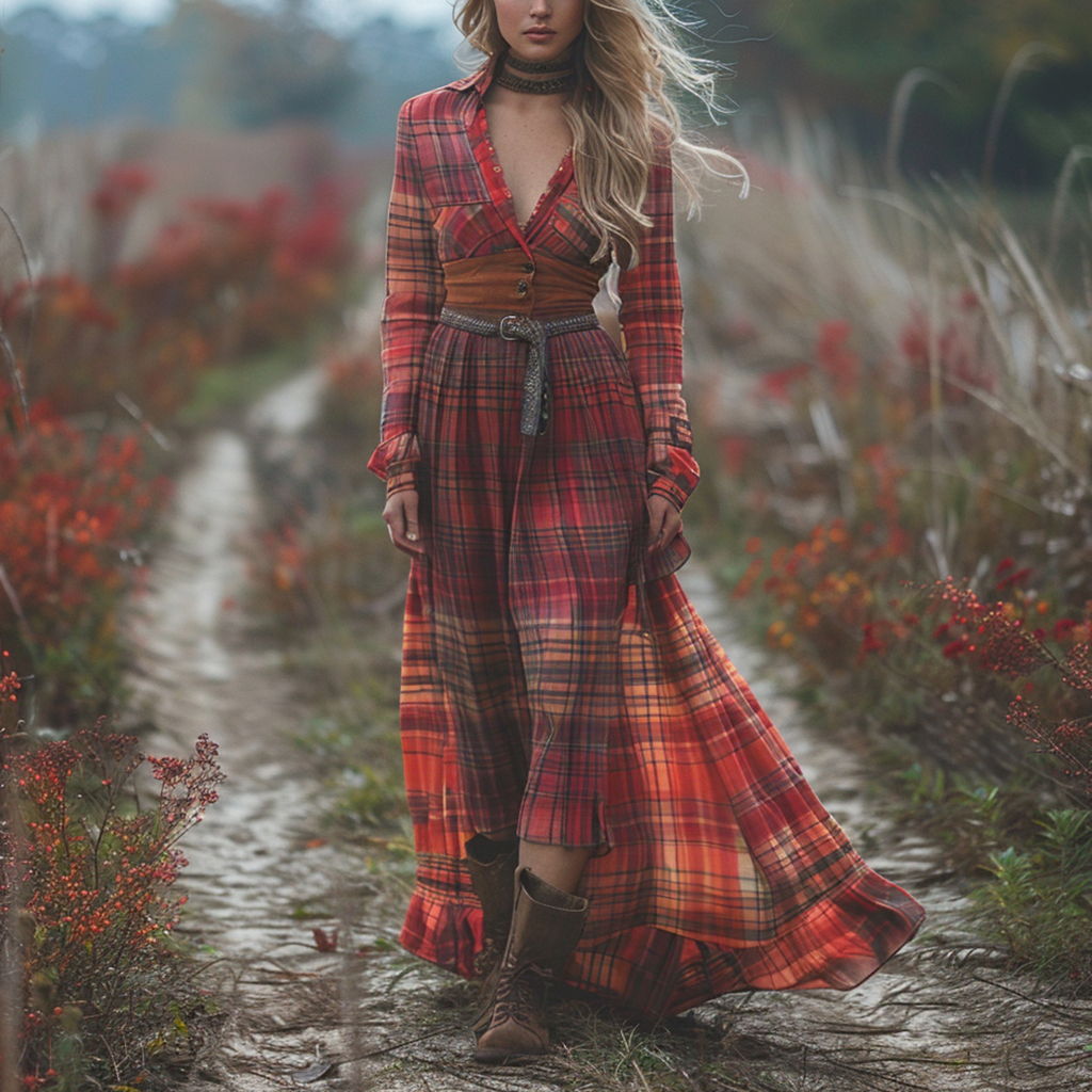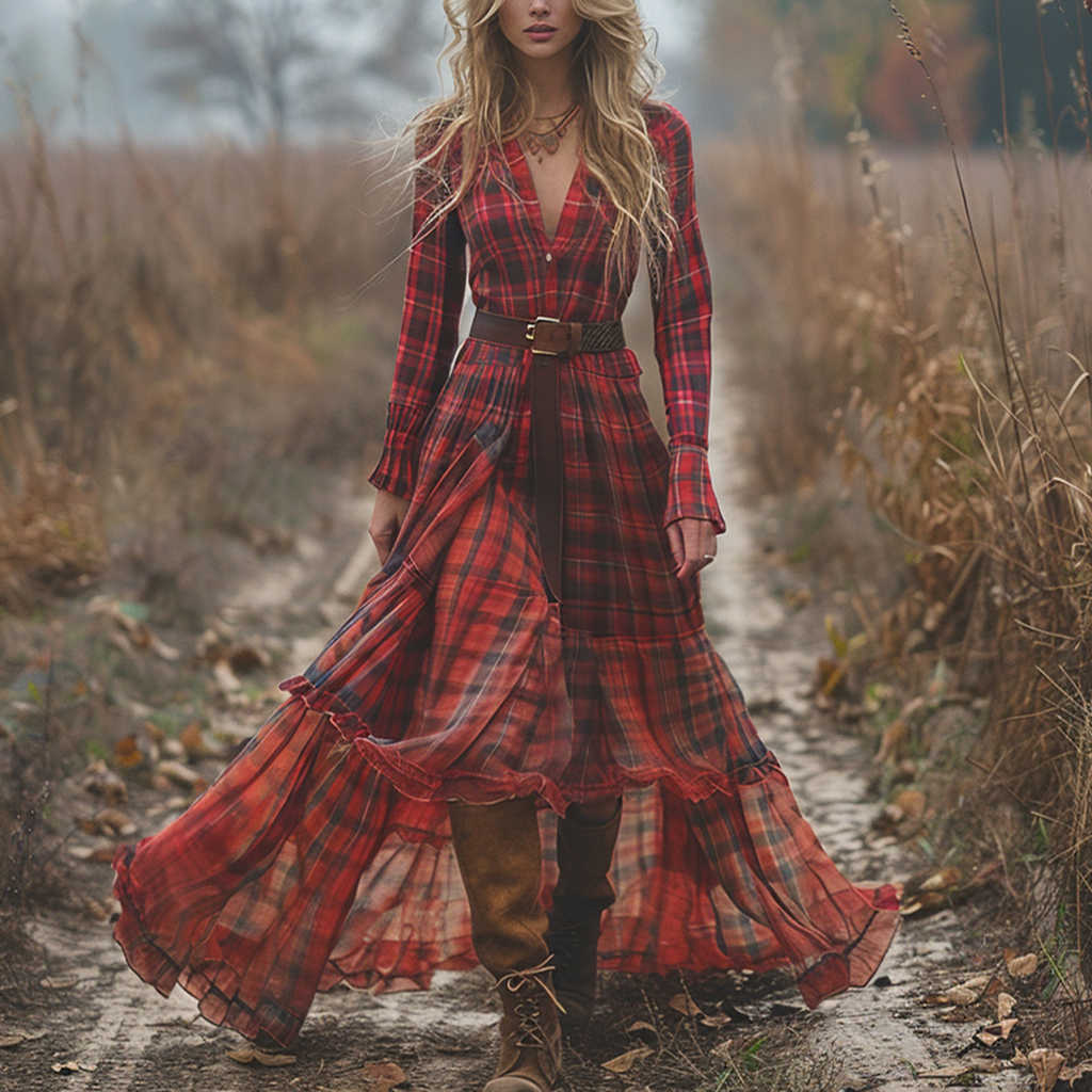Women's Retro V-neck Plaid Long-sleeve Bohemian Pastoral Style Maxi Long Dress