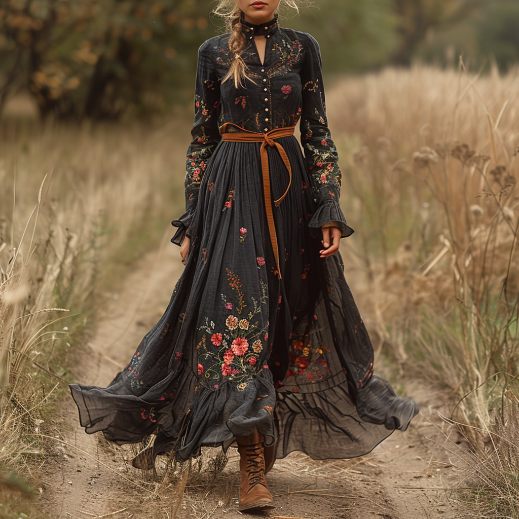 Women's Vintage Country Pastoral Linen Style Long-sleeve Maxi Long Dress