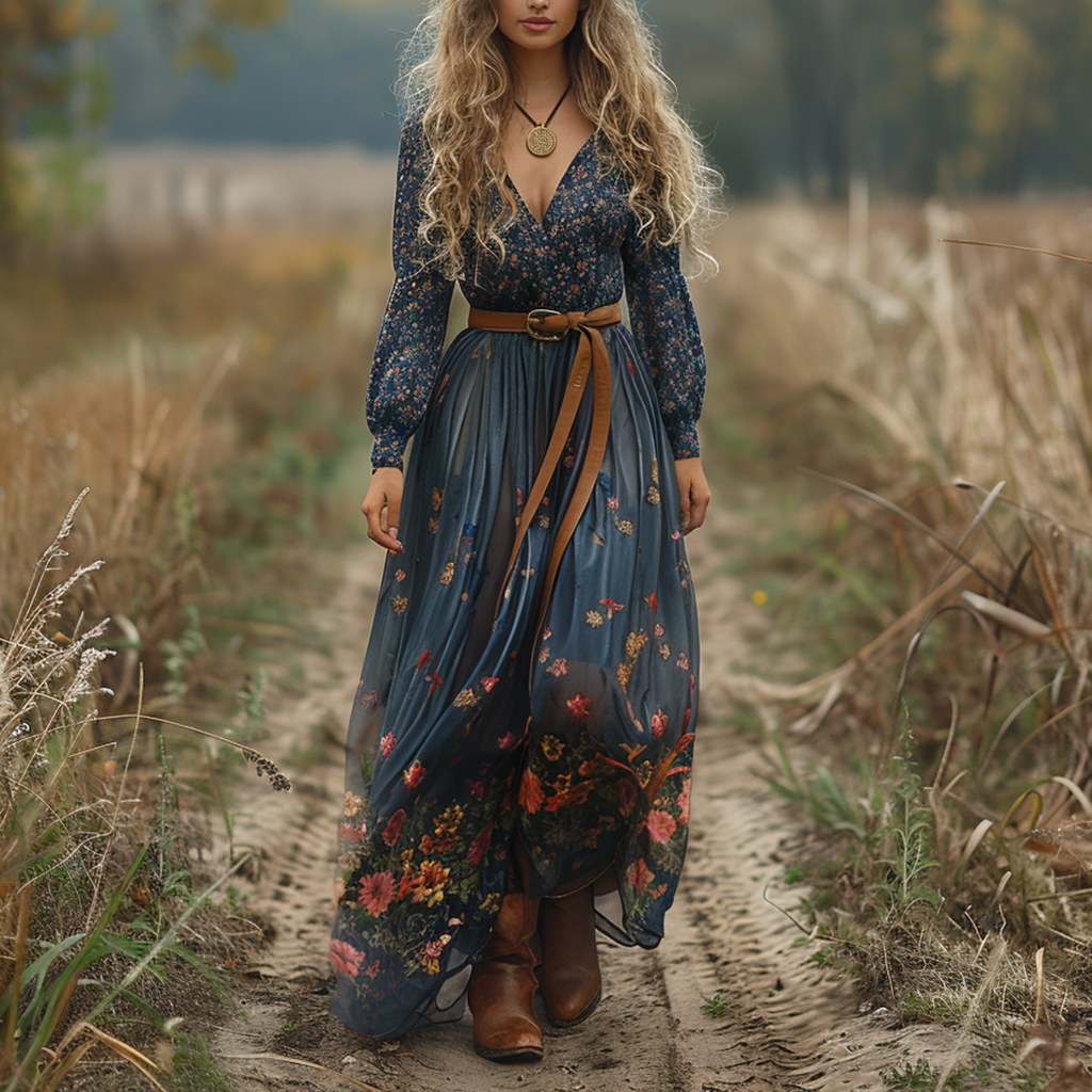 Women's Vintage V-neck Floral Bohemian Pastoral Style Long-sleeved Maxi Long Dress