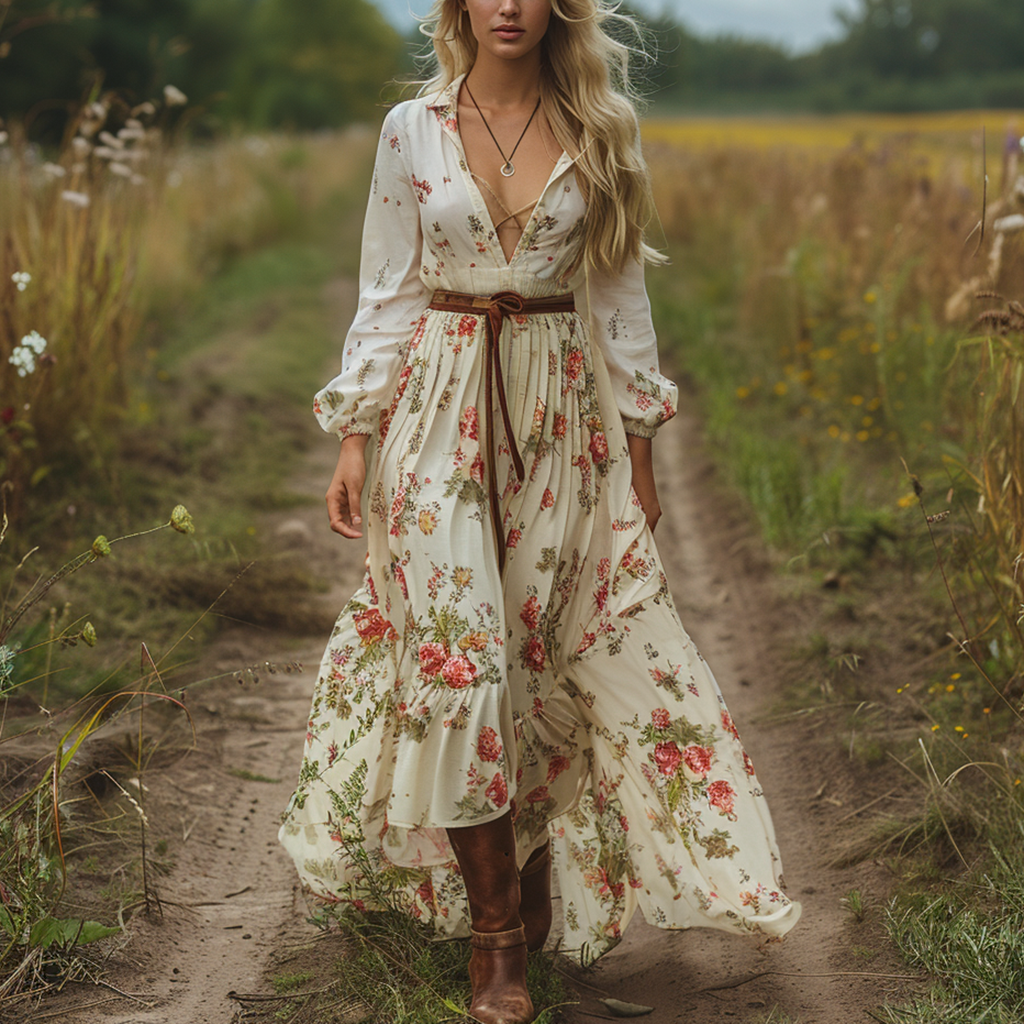 Women's Vintage V-neck Bohemian Pastoral Style Long-sleeved Maxi Long Dress