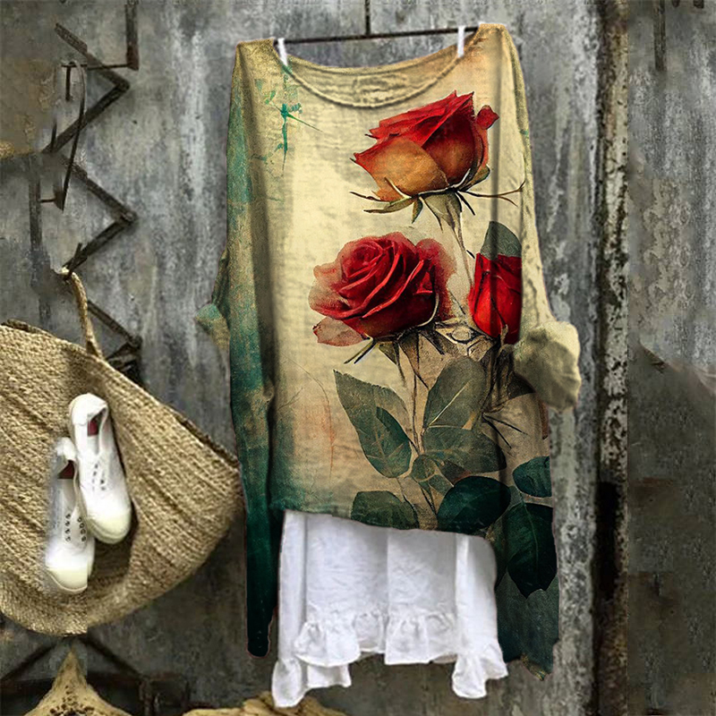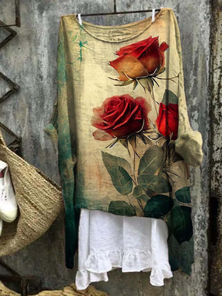 Women's Vintage Rose Print Linen Blend Shirt$23.19 USD
