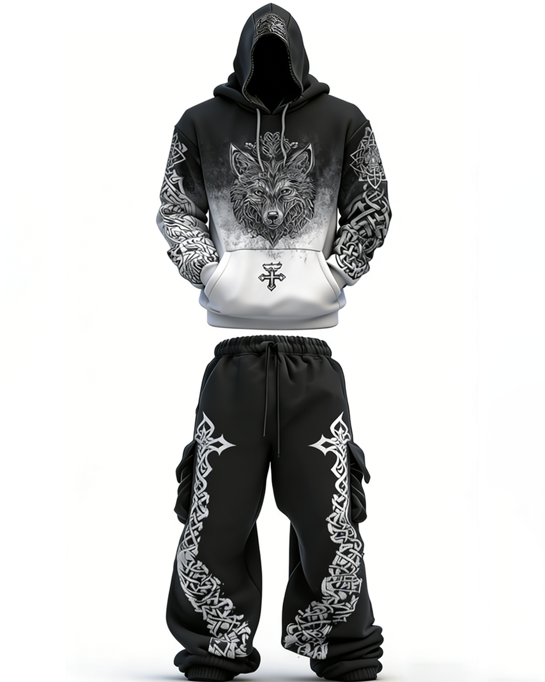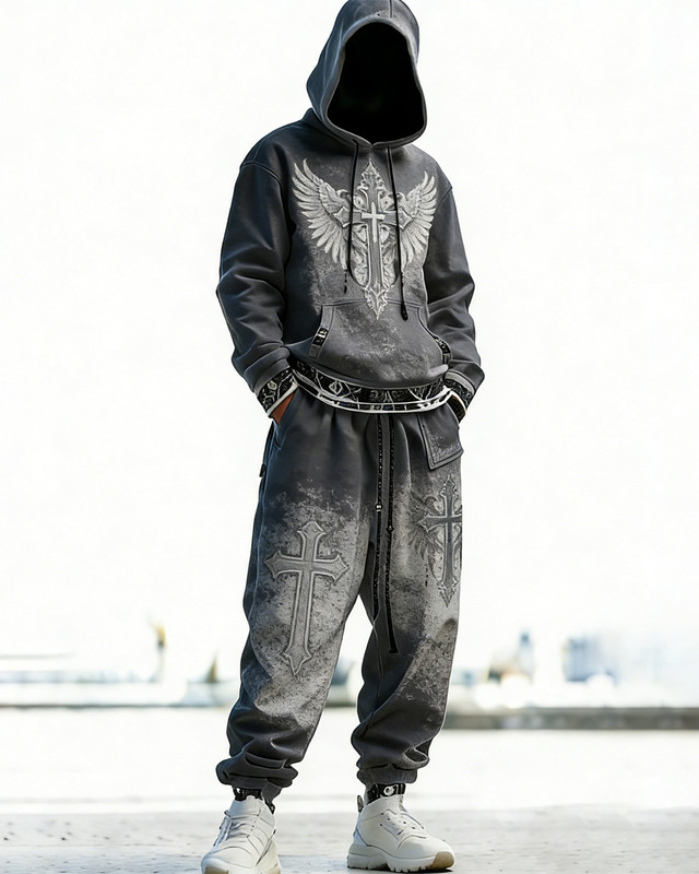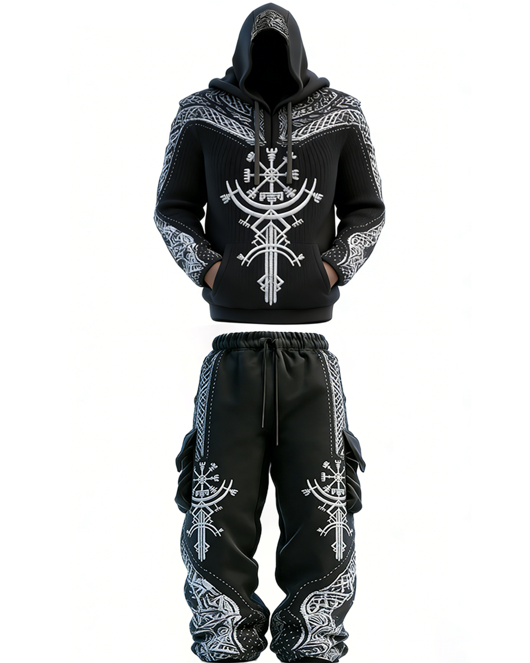 Men's Viking-themed cross-embroidered hoodie and pants two-piece set 5674$50.69 USD$82.82 USD