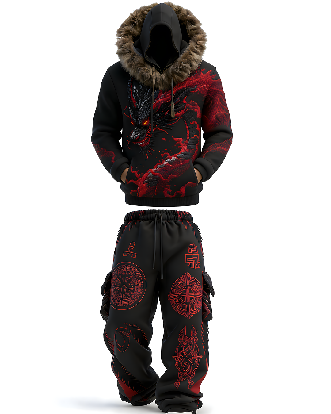 Men's Viking-Style Faux Fur Collar Embroidered Hoodie and Pants Two-Piece Set 9774$53.99 USD$89.98 USD