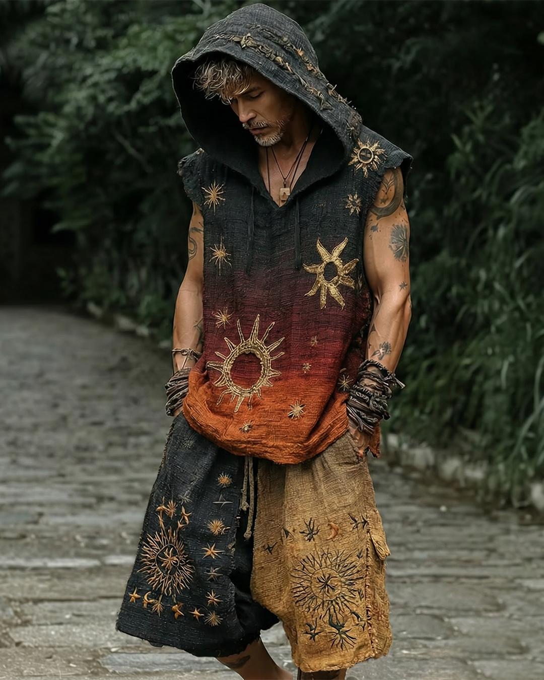 Men's Viking Gradient Linen Sleeveless Hooded Top and Pants Two-Piece Set 3231$42.99 USD$73.32 USD