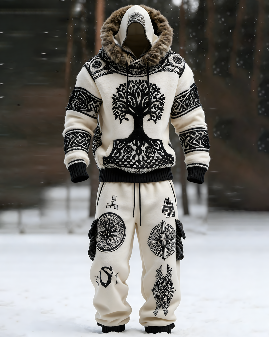 Men's Winter Warmth Wolf Faux Fur Hoodie and Pants Two-Piece Set 7352$53.99 USD$89.98 USD