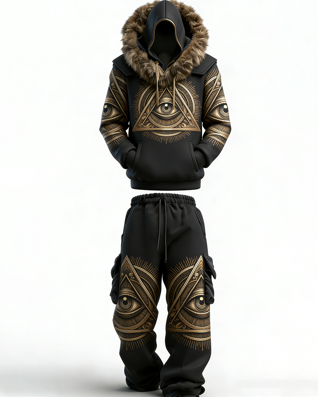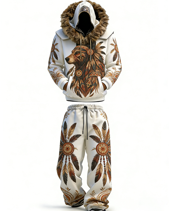Men's Fashion Contrast Color Wolf Fur Collar Hooded Pants Two-Piece Set 8548$49.99 USD$83.32 USD
