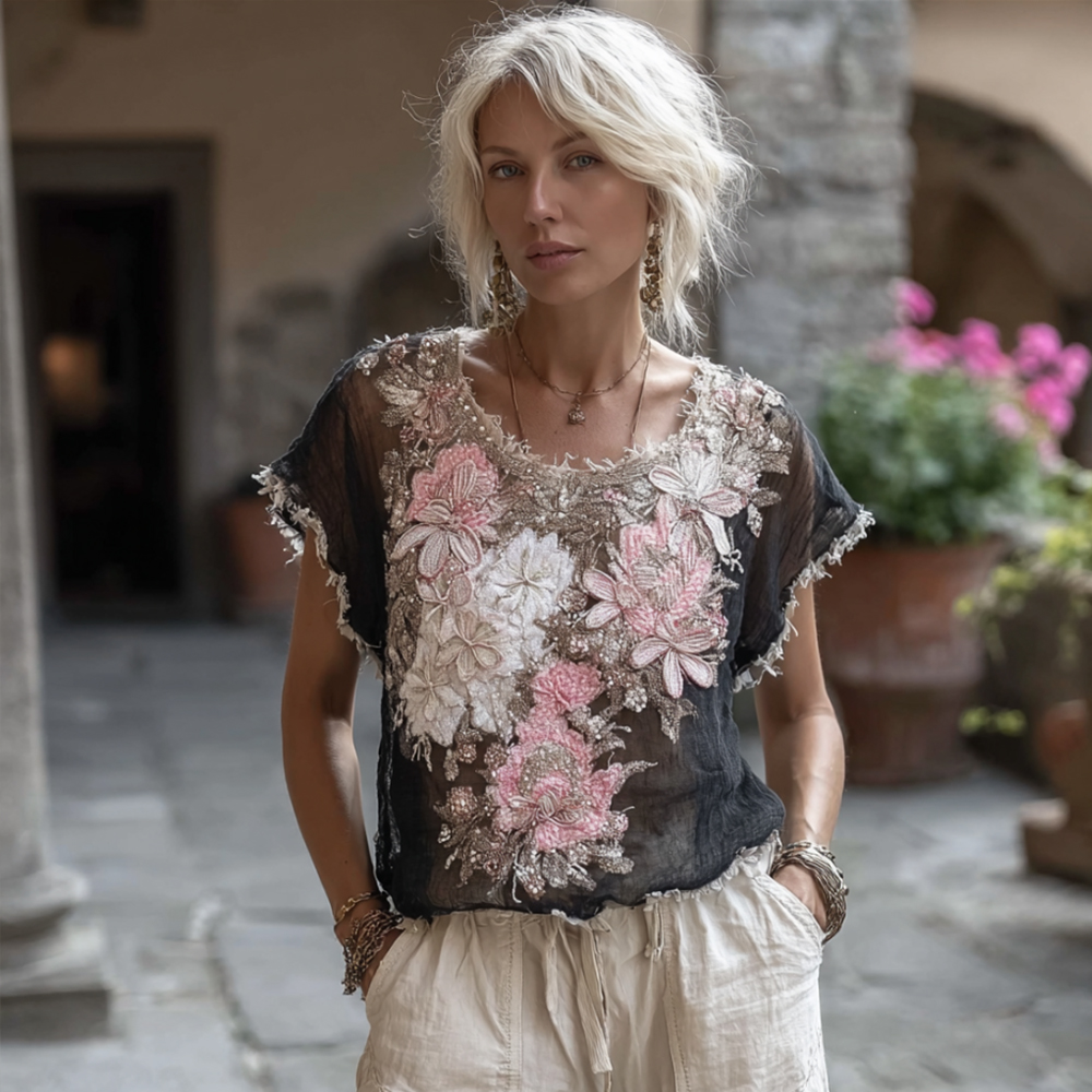 Bohème Style Embroidered Rose Gradient Tie-dye Short-sleeved Round-neck Top