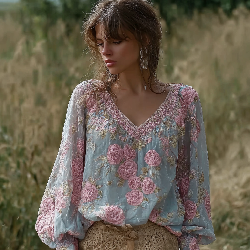 Bohemian Retro Countryside Plant Flower Pattern V-neck Top