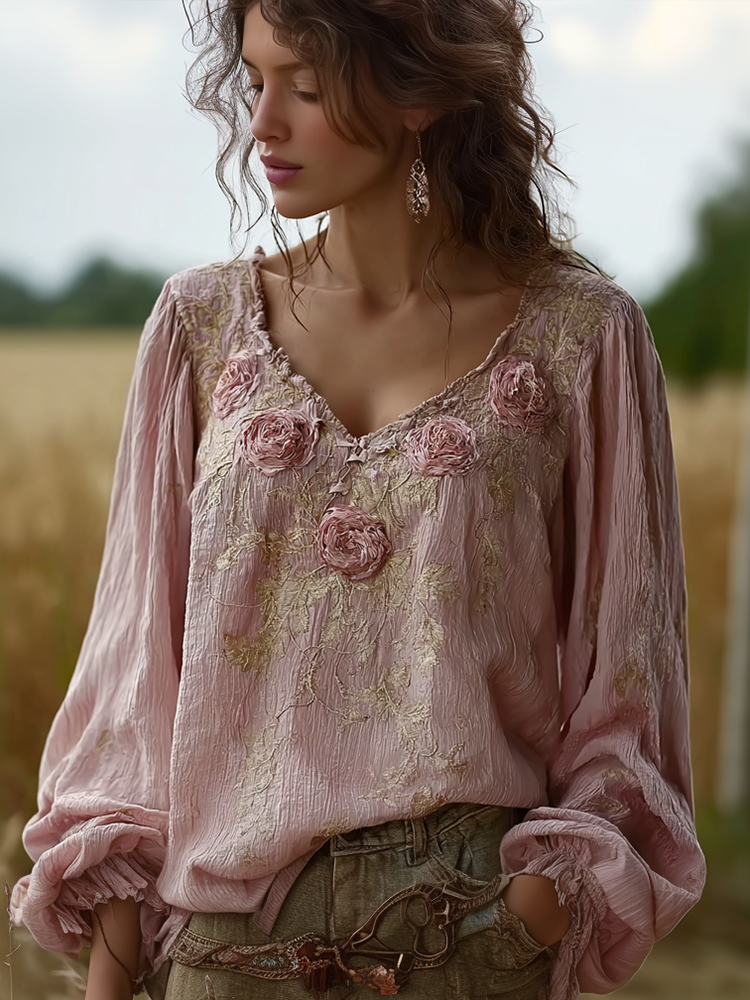 Bohemian Retro Countryside Style Plant Flower Design Cotton And Linen Women's Long-sleeve Shirt