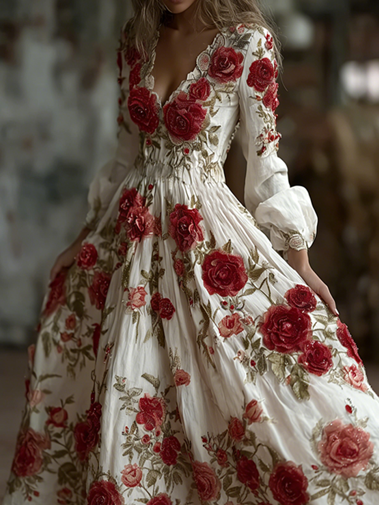 Bohemian Style Red Rose Retro Cotton And Linen Woman's V-neck Dress