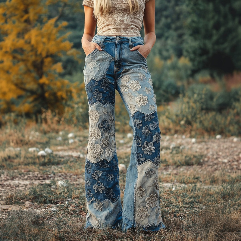 Boho Floral Lace Embroidered Patchwork Bootcut Jeans