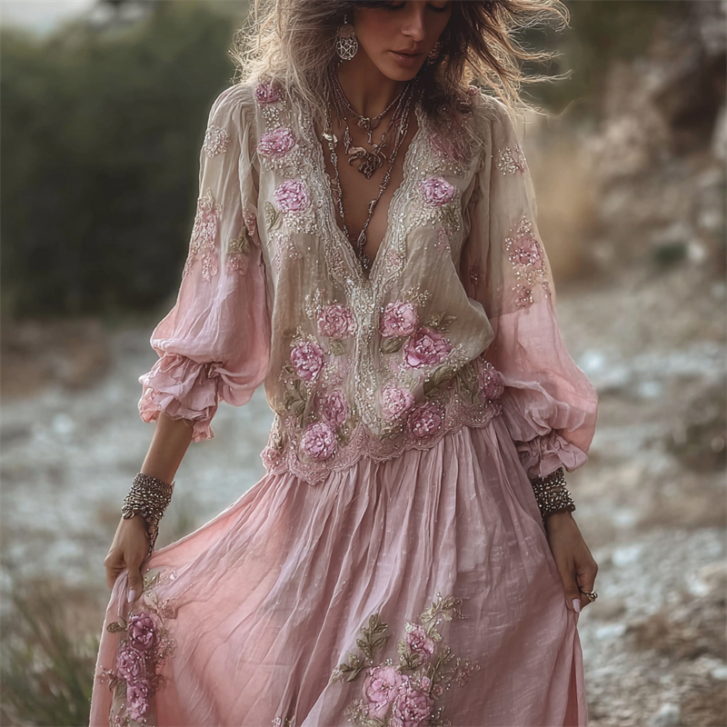 Boho Glitter Pink Roses Lace Gradient Flowy Linen Maxi Dress