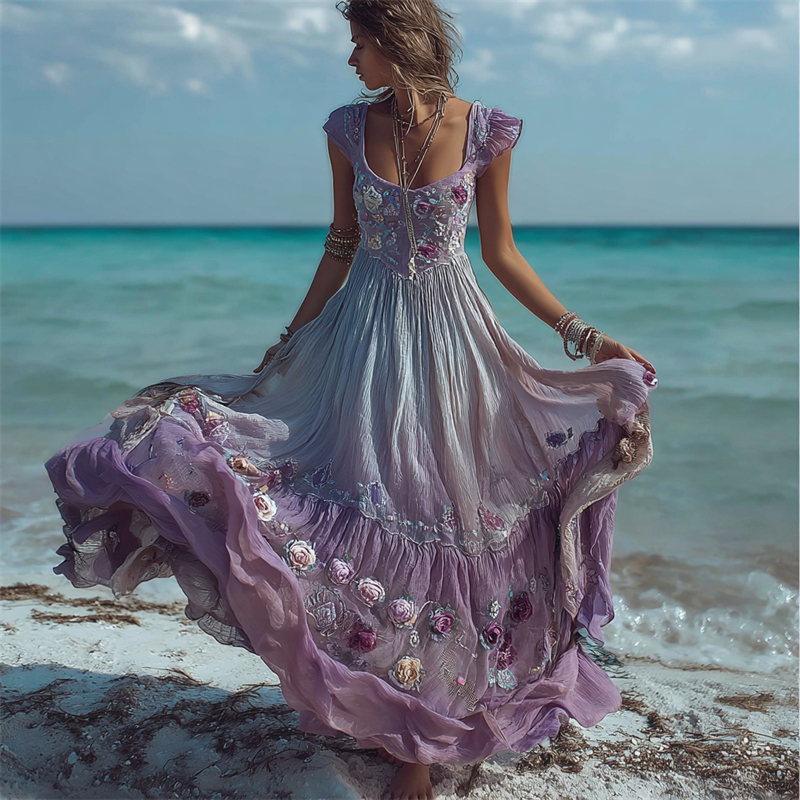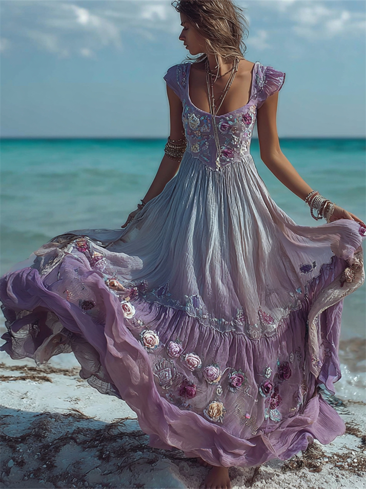 Boho Lavender Floral Dyed Flowy Linen Maxi Dress