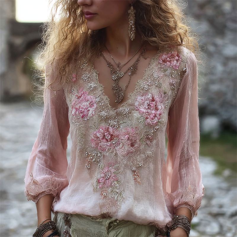 Boho Pink Floral Beaded Lace Flowy Linen Tunic