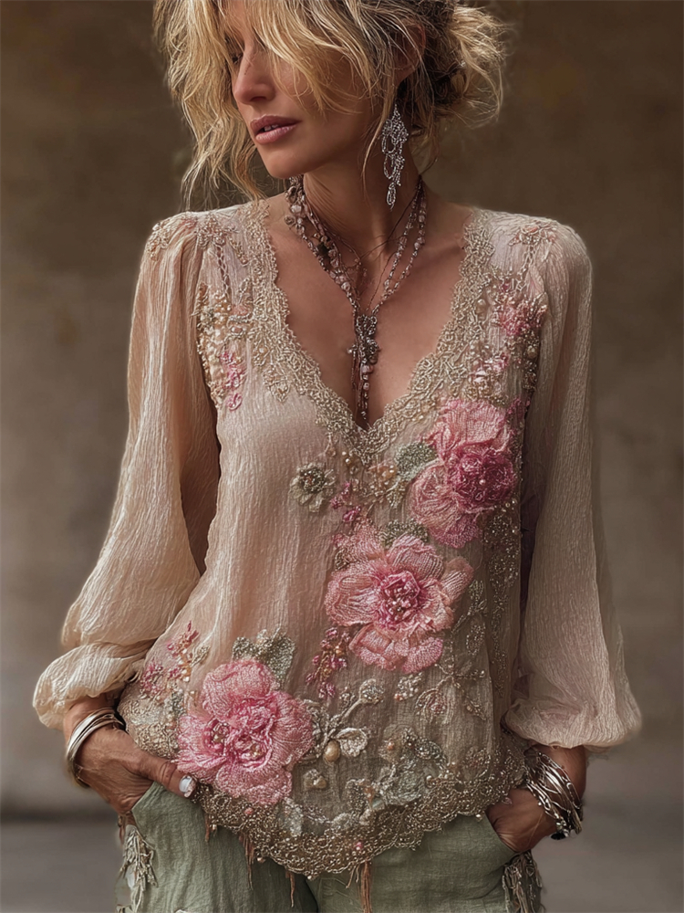 Boho Pink Floral Lace Embroidered V Neck Linen Tunic