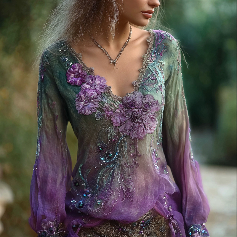 Boho Purple Flowers Lace Gradient Flowy Linen Tunic