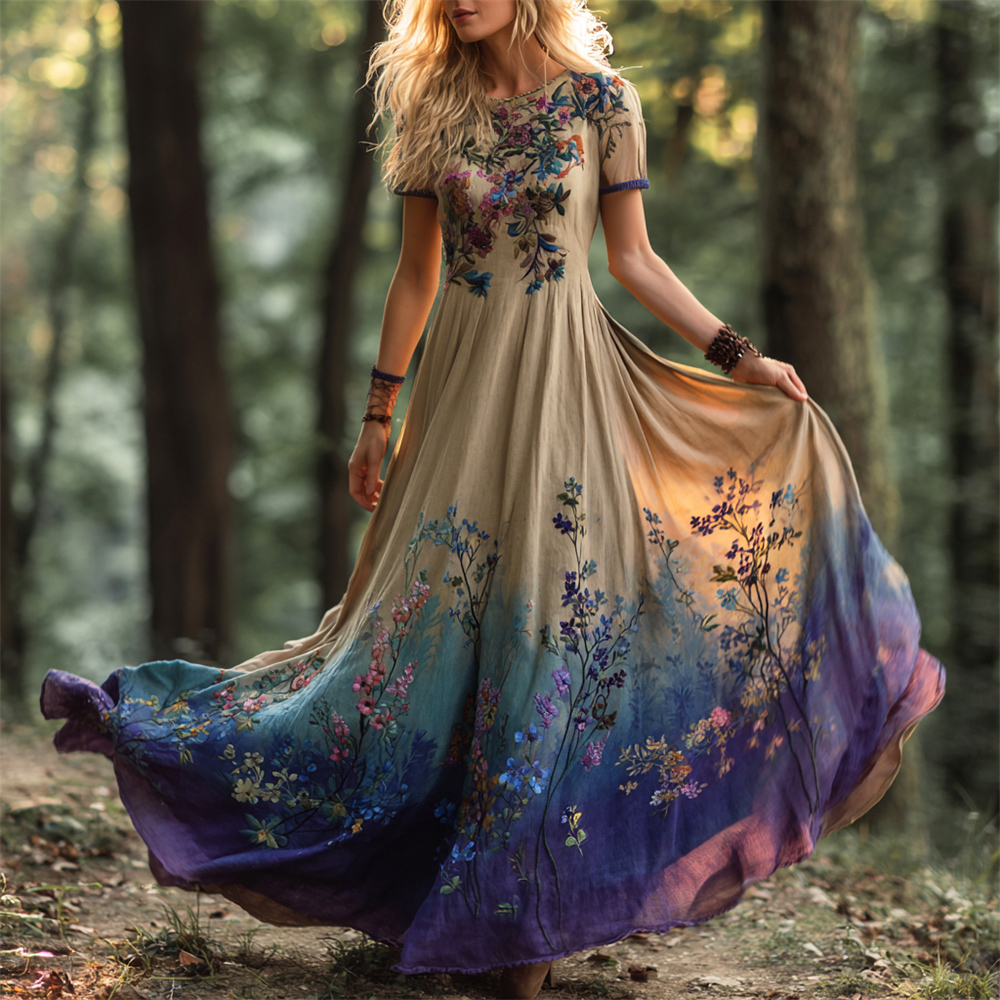 Boho Vintage Ethnic Floral Art Women's Linen Short Sleeve Flowy Maxi Dress