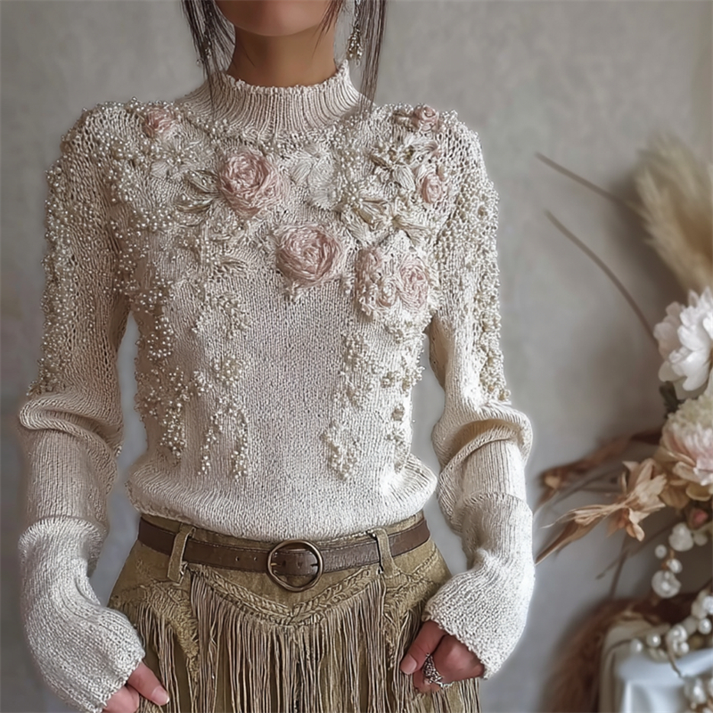 Classy Roses Pearls Beaded Turtleneck Cozy Knit Sweater