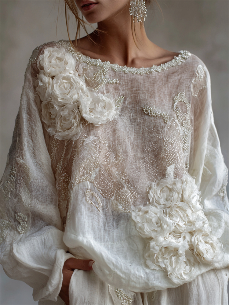 Classy White Roses Pearl Beaded Flowy Linen Tunic