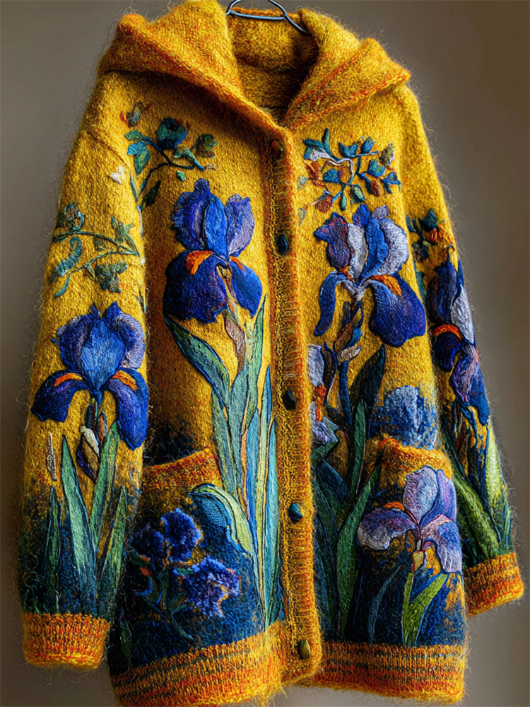Elegant Irises Felt Embroidered Cozy Knit Hooded Cardigan