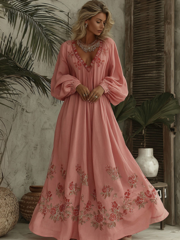 Elegant Rose Floral Pattern V-neck Long-sleeved Dress For Women