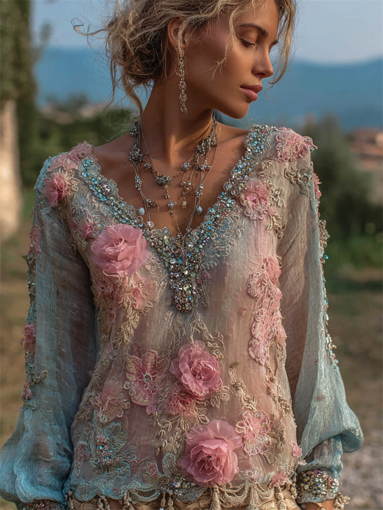 Floral Glitter Diamonds Beaded Gradient Flowy Linen Tunic