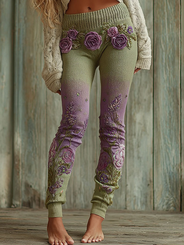 Lassy Gradient Purple Lavender And Floral Art Cozy Knit Leggings