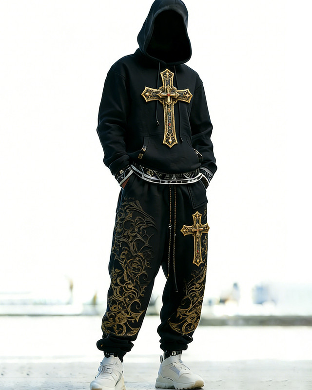 Men's Viking Cross Embroidered Hoodie and Pants Two-Piece Set 3010