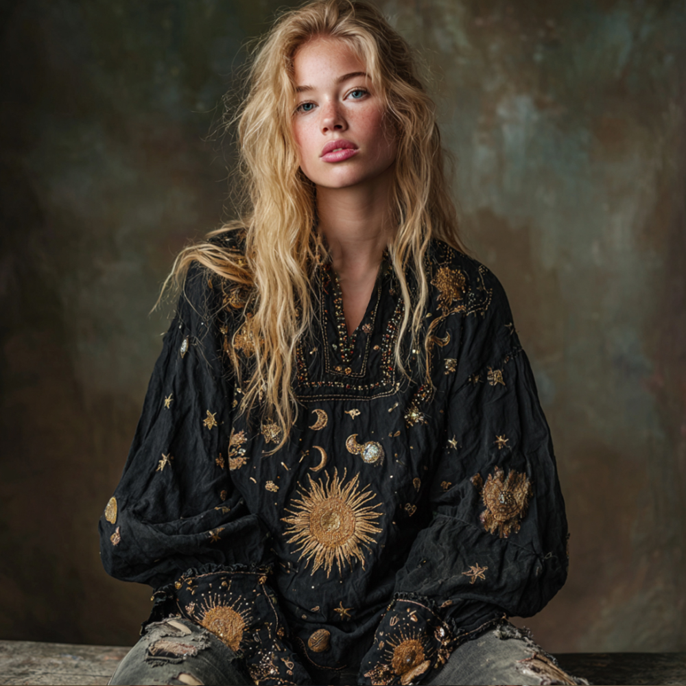 Mysterious Moon Sun V-neck Embroidered Loose Top