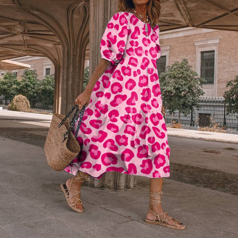 Pink Leopard Print Round Neck Short Sleeve Midi Dress