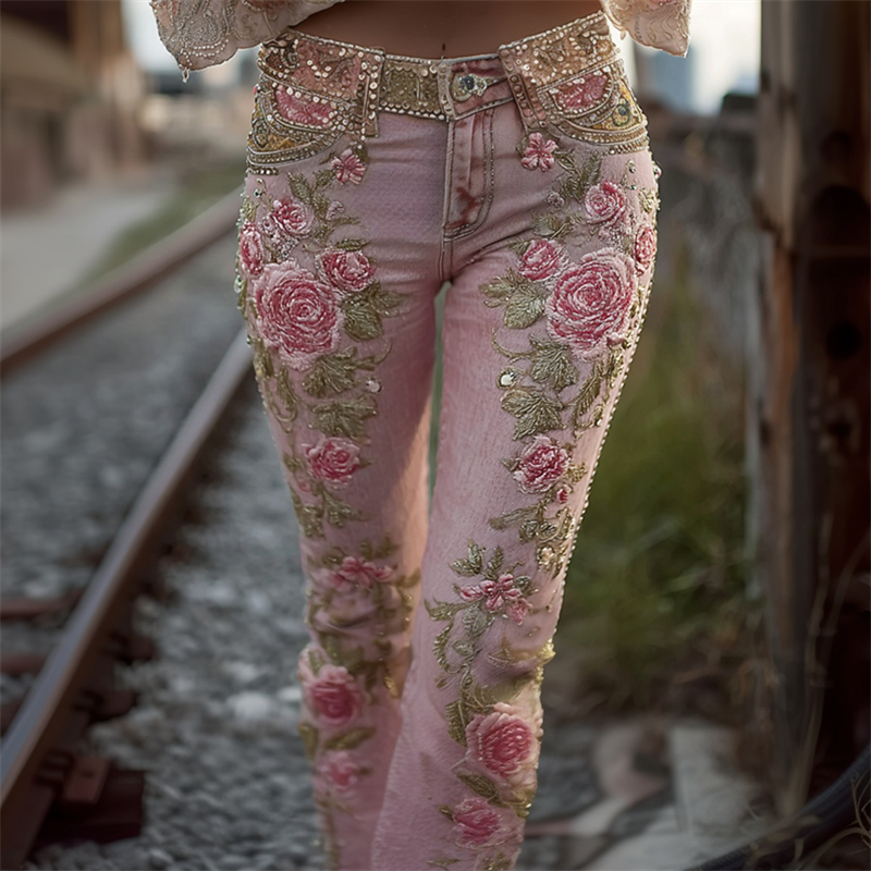 Pink Roses Glitter Embroidered Washed Bootcut Jeans