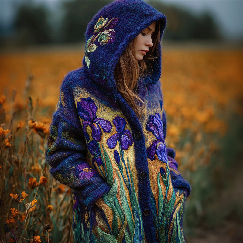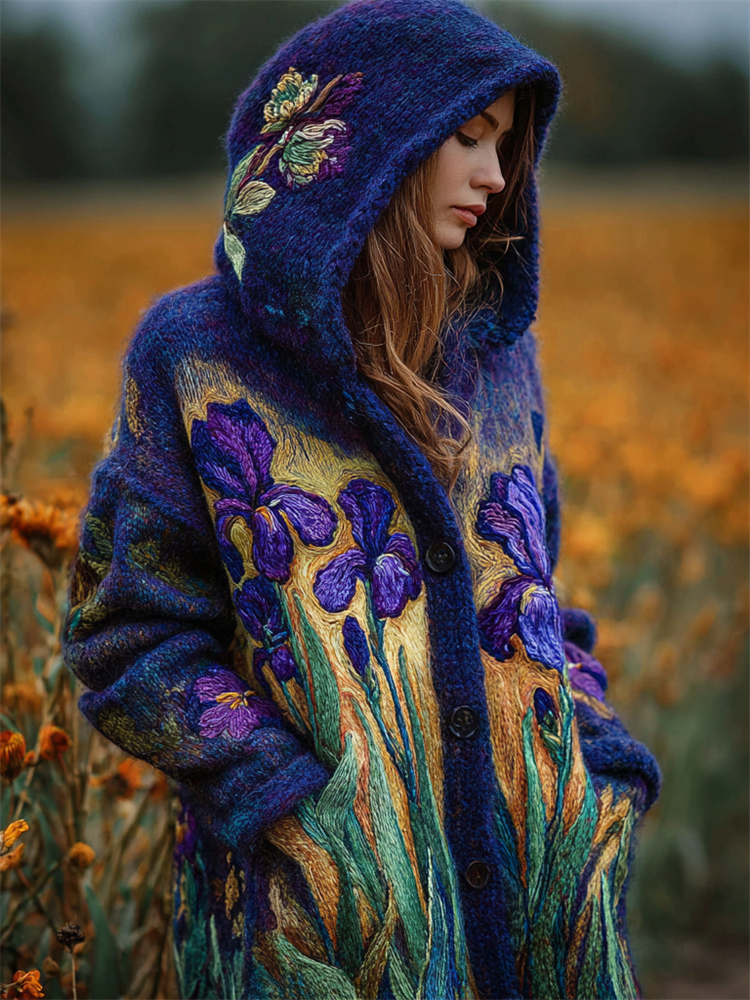 Purple Irises Felt Embroidered Cozy Knit Hooded Cardigan