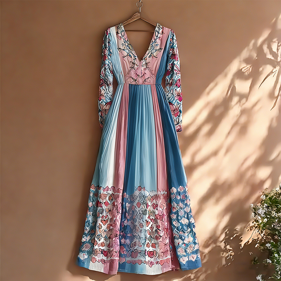 Retro Butterfly Print Transgender Colorblock Patchwork Dress