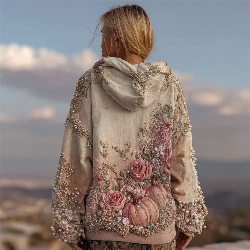 Thanksgiving Pink Pumpkins Roses Glitter Beaded Comfy Hoodie