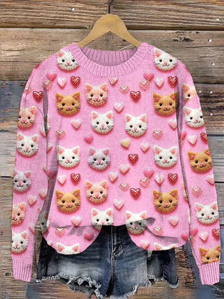 Valentine Hearts and Cats Print Casual Cozy Knit Sweater