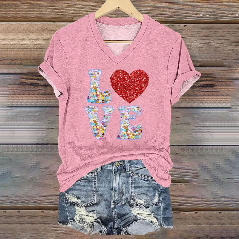 Valentine's Day Glitter Love Heart Art V Neck T Shirt