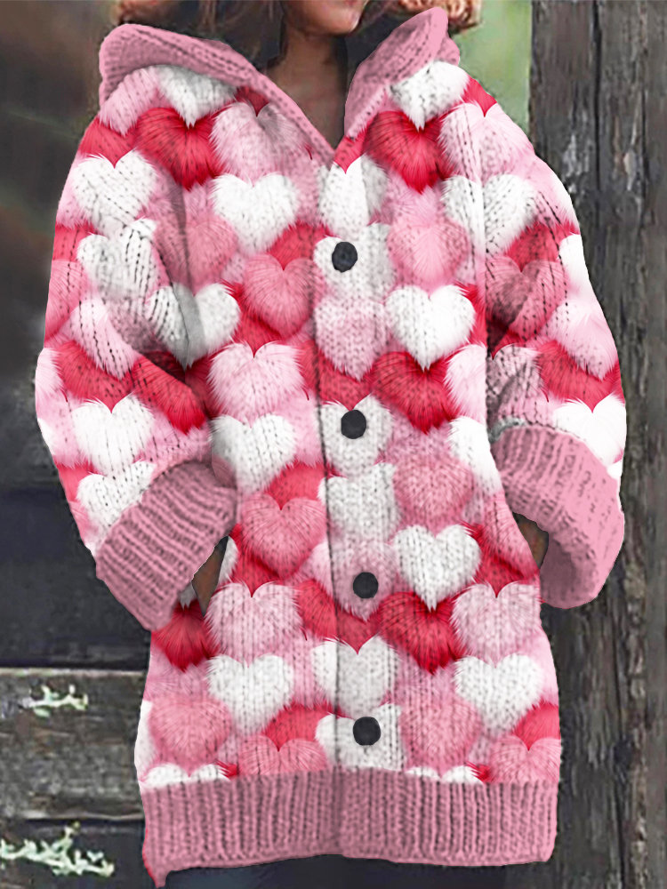 Valentine's Day Love Heart Fleece Print Cozy Hooded Cardigan