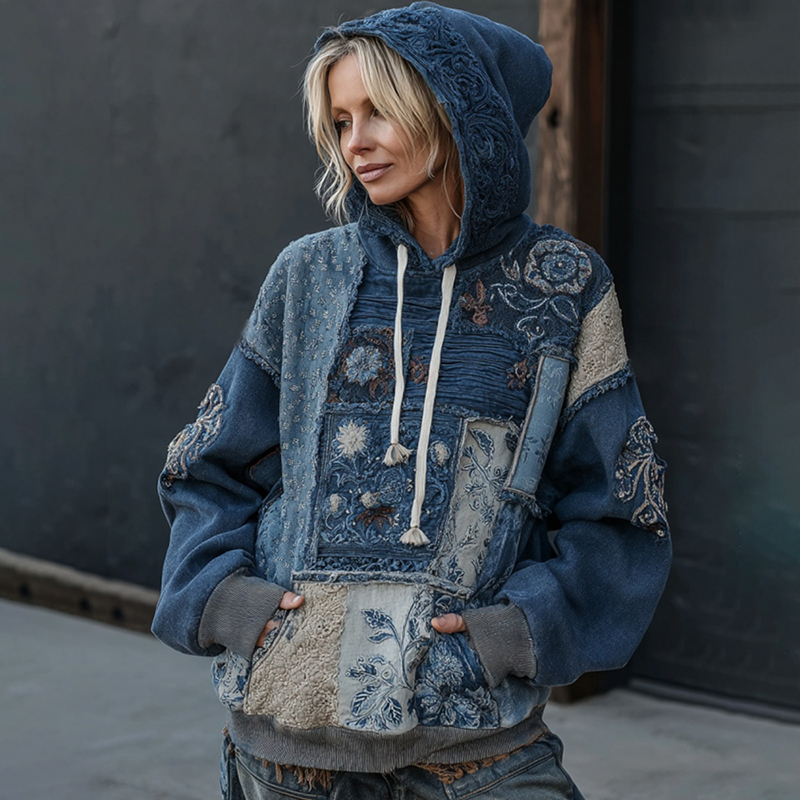 Vintage Boho Floral Embroidered Patchwork Hoodie