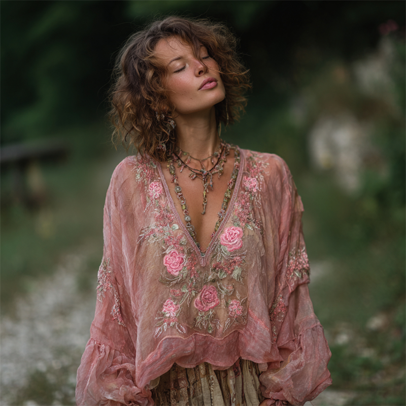 Vintage Boho Pink Roses Embroidered Flowy Linen Tunic